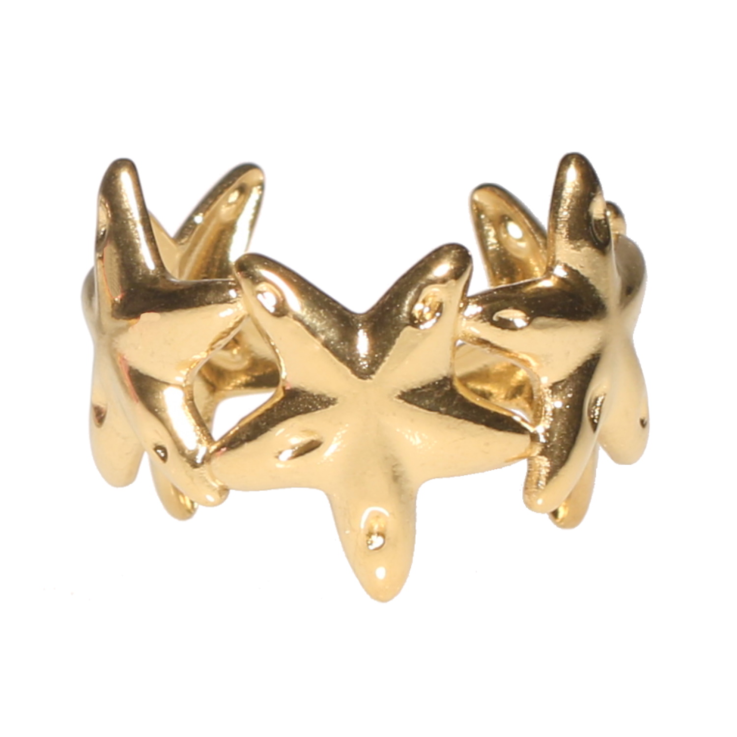 Description Bague composée d'étoiles en acier doré. Taille ajustable. Largeur 14 mm Matière(s) Acier . L'acier utilisé dans la bijouterie existe sous plusieurs qualités. Nous utilisons principalement la qualité 316L, qualité qui est utilisée en chirurgie. Cet acier est donc inoxydable et reste très résistant. Fermoir Aucun Couleur(s) dominante(s) Doré Public Adolescent , Adulte . Genre Femme , Fille . Saison Indémodable . Thème(s) Nature . Cliquez sur une matière, un thème, une couleur ou une collection pour voir tous les articles associés.