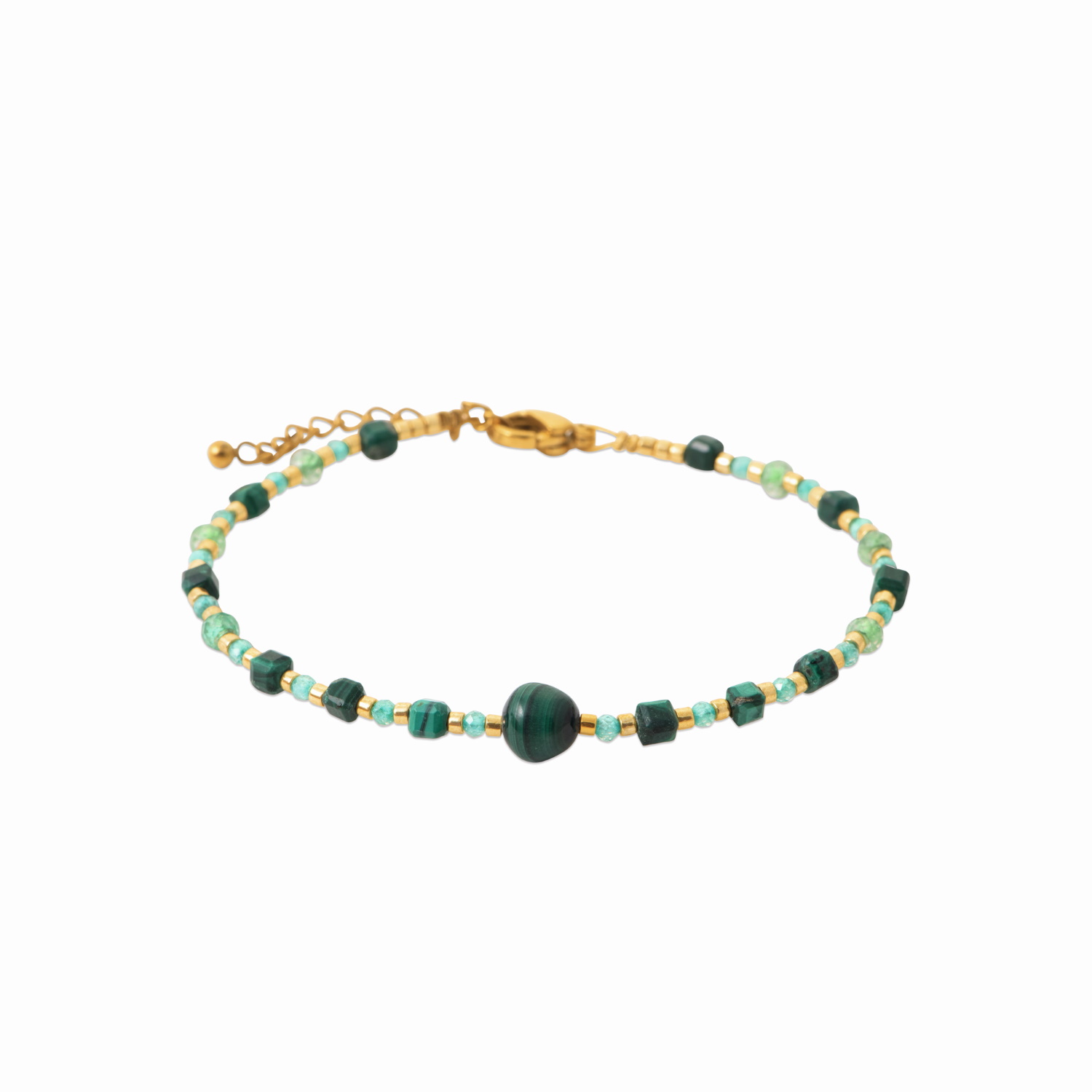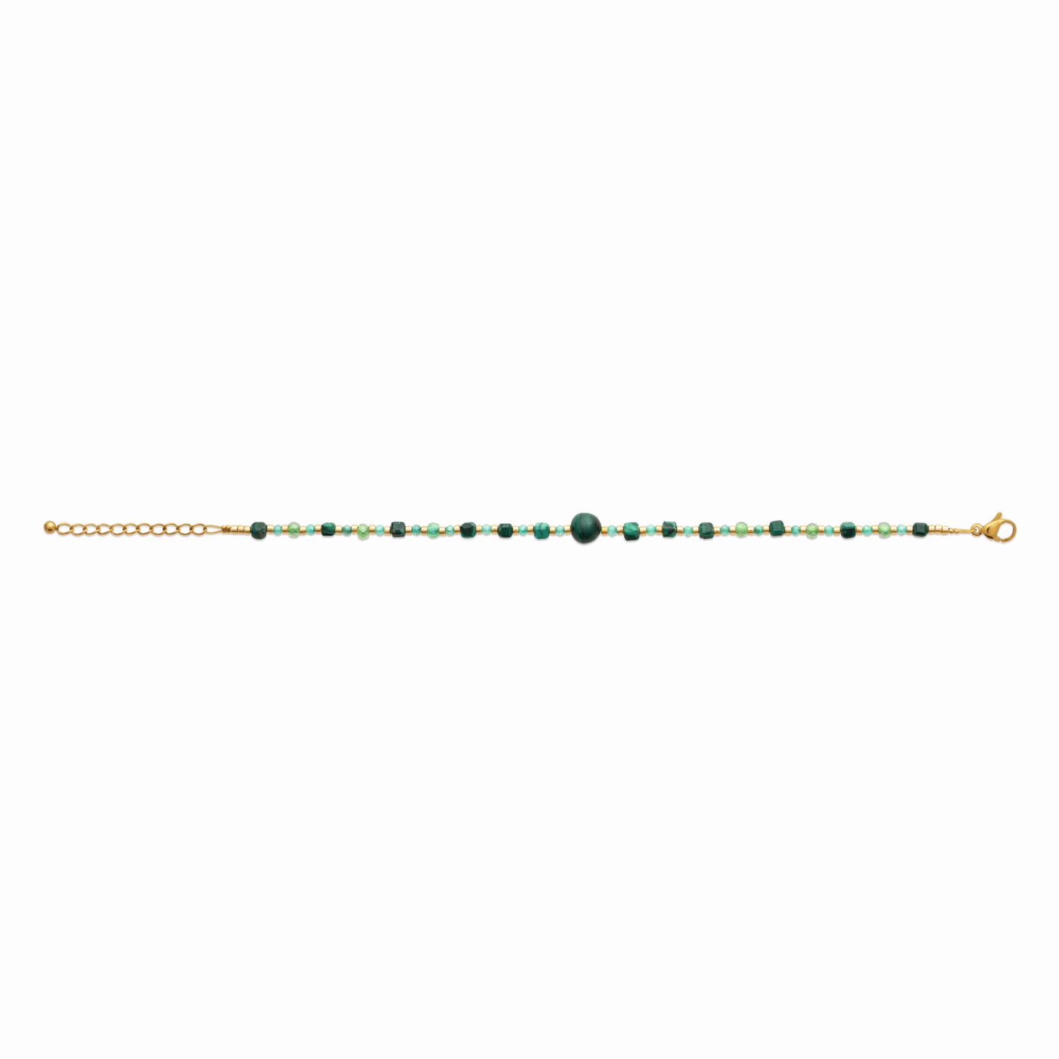 Description Bracelet composé de perles cylindriques en acier chirurgical 316L doré et de perles en véritable pierre de malachite. Fermoir mousqueton avec 2 cm de rallonge. Cliquez sur une matière, un thème, une couleur ou une collection pour voir tous les articles associés.