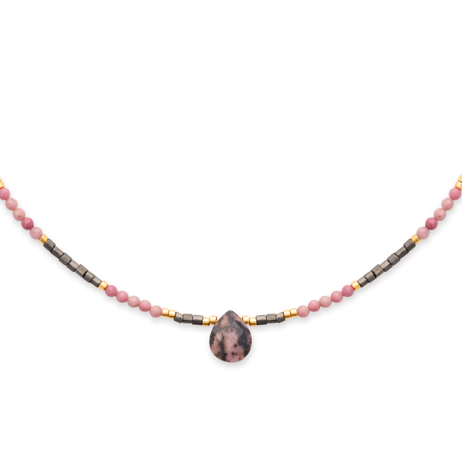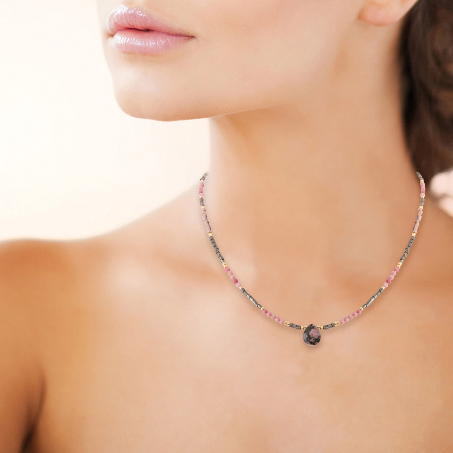 Description Collier composé de perles cylindriques en acier chirurgical 316L doré et de perles en véritable pierre de rhodonite. Fermoir mousqueton avec 5 cm de rallonge. Cliquez sur une matière, un thème, une couleur ou une collection pour voir tous les articles associés.