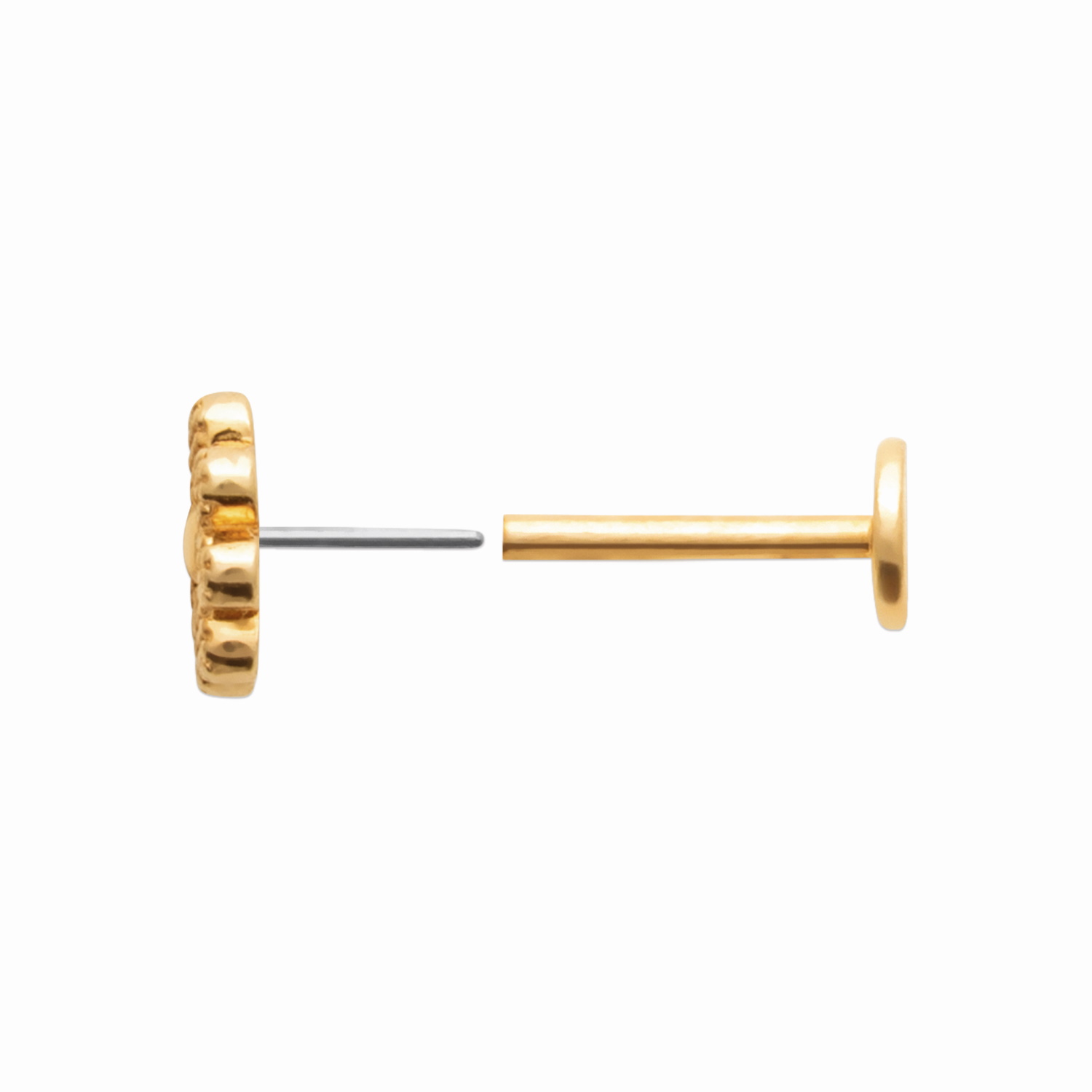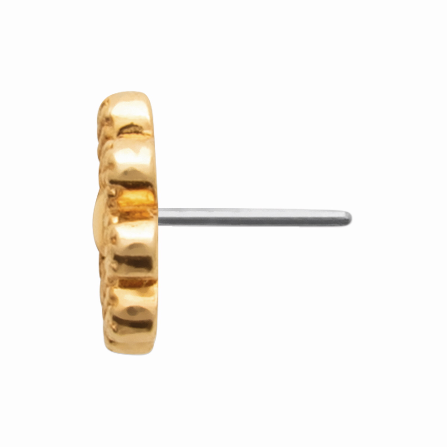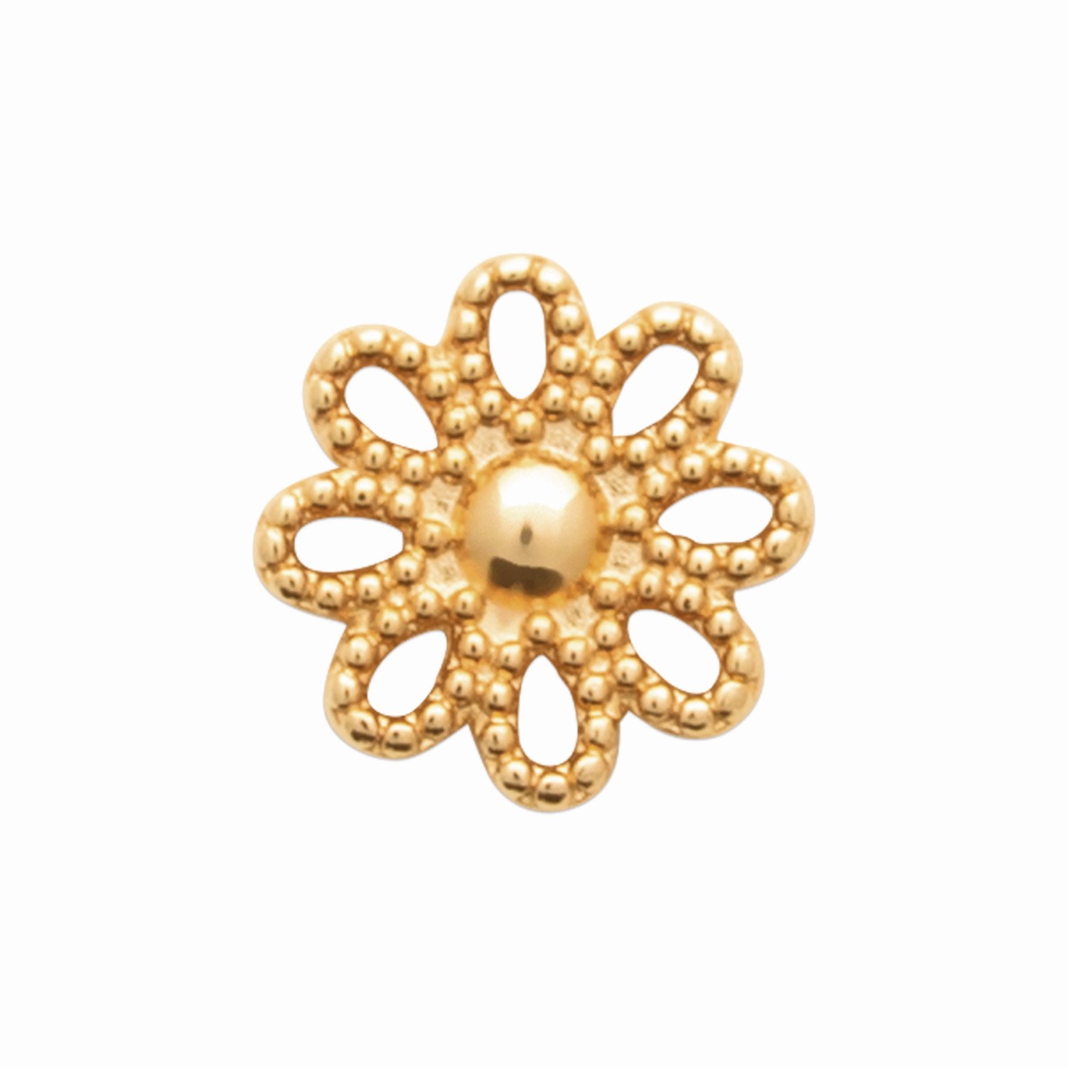 Description Piercing en forme de fleur en plaqué or jaune 18 carats et une tige en titane. Vendu à l'unité. Longueur 10 mm [Guide des tailles] Largeur 7 mm Diamètre 4 mm Matière(s) Plaqué or , Titane . Nos bijoux en plaqué or sont faits sur une base de laiton et recouverts d'or 18 carats à 3 microns sans dispersion. Cela signifie que nous garantissons 3 microns d'or sur n'importe quelle partie du bijou. Sur la plupart de nos bijoux empierrés, nous montons à 5 microns d'or 18 carats. Pour finir, nous faisons également une finition avec de l'or 24 carats afin de donner un plus bel éclat à nos bijoux. Fermoir Tiges poussettes Couleur(s) dominante(s) Doré Public Adolescent , Adulte . Genre Femme , Fille . Saison Indémodable . Thème(s) Fleurs , Nature . Cliquez sur une matière, un thème, une couleur ou une collection pour voir tous les articles associés.