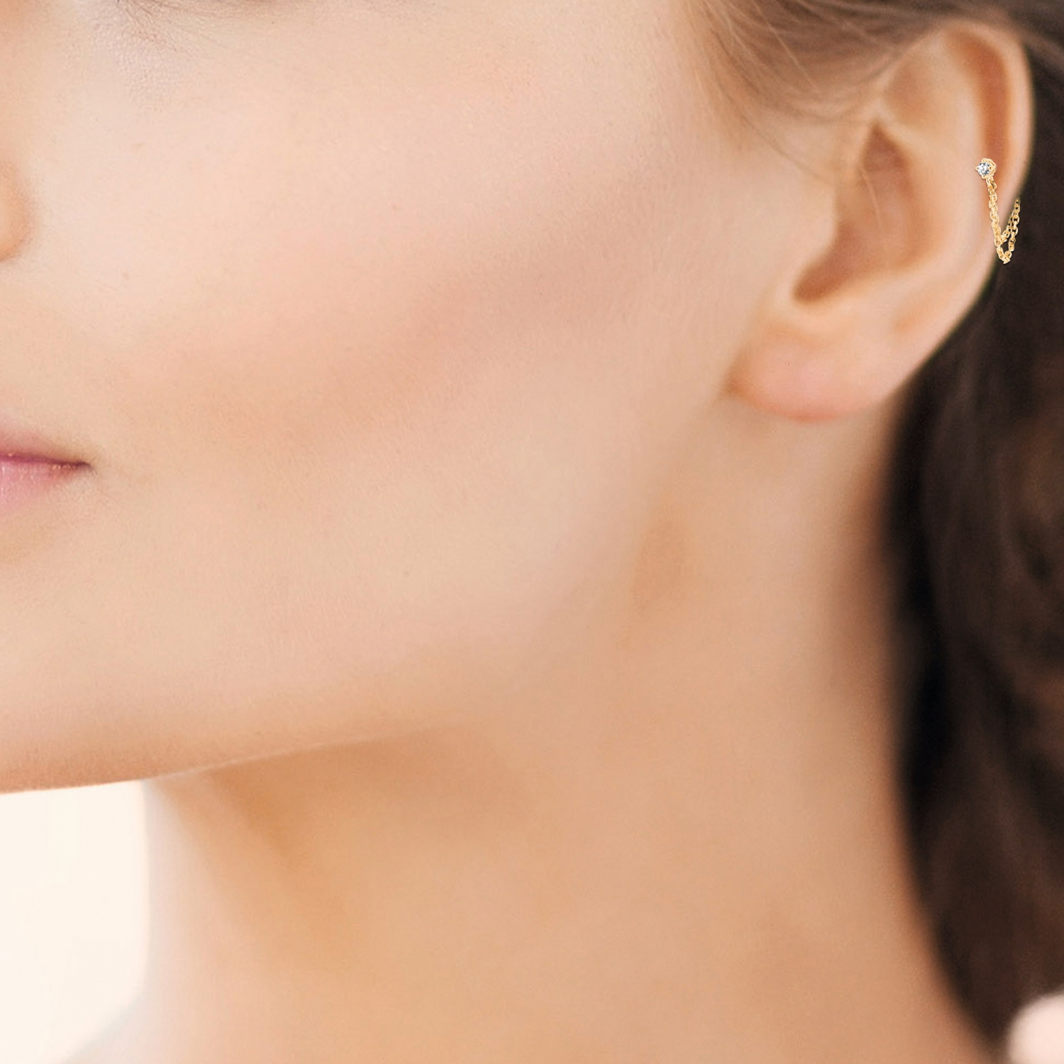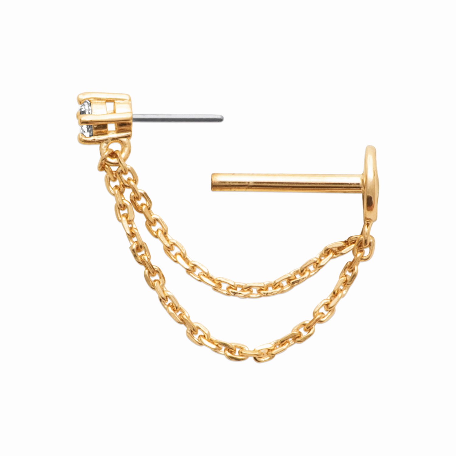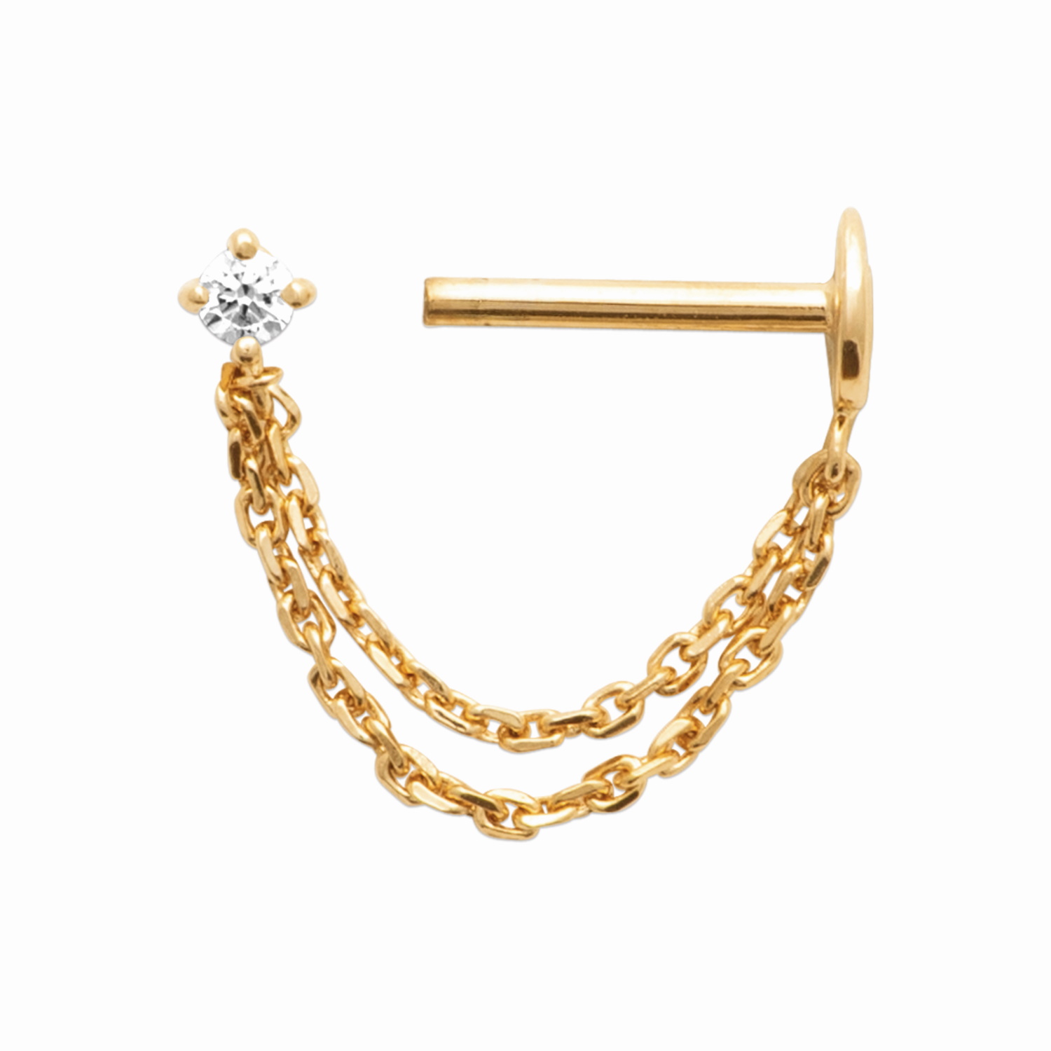 Description Piercing avec deux chaînettes en plaqué or jaune 18 carats serti griffes d'un oxyde de zirconium blanc et une tige en titane. Vendu à l'unité. Longueur 12 mm [Guide des tailles] Diamètre 3/4 mm Matière(s) Plaqué or , Titane , Zirconium . Nos bijoux en plaqué or sont faits sur une base de laiton et recouverts d'or 18 carats à 3 microns sans dispersion. Cela signifie que nous garantissons 3 microns d'or sur n'importe quelle partie du bijou. Sur la plupart de nos bijoux empierrés, nous montons à 5 microns d'or 18 carats. Pour finir, nous faisons également une finition avec de l'or 24 carats afin de donner un plus bel éclat à nos bijoux. Fermoir Tiges poussettes Couleur(s) dominante(s) Doré Public Adolescent , Adulte . Genre Femme , Fille . Saison Indémodable . Cliquez sur une matière, un thème, une couleur ou une collection pour voir tous les articles associés.