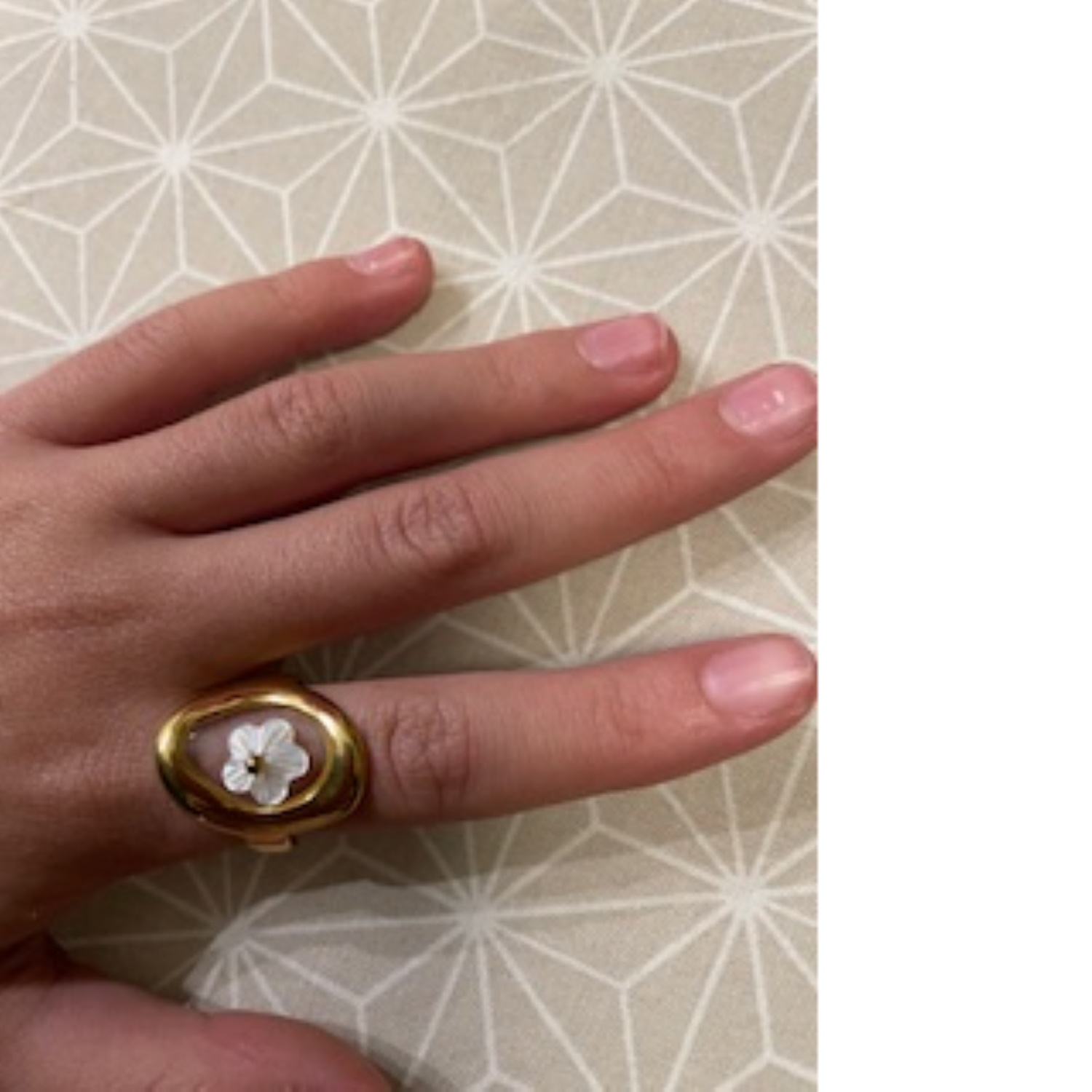 Description Bague en acier inoxydable doré surmontée d'une fleur en nacre d'imitation. Taille ajustable. Largeur 22 mm Matière(s) Acier , Plastique . L'acier utilisé dans la bijouterie existe sous plusieurs qualités. Nous utilisons principalement la qualité 316L, qualité qui est utilisée en chirurgie. Cet acier est donc inoxydable et reste très résistant. Fermoir Aucun Couleur(s) dominante(s) Blanc , Doré Public Adolescent , Adulte . Genre Femme , Fille . Saison Indémodable . Thème(s) Fleurs , Nature . Cliquez sur une matière, un thème, une couleur ou une collection pour voir tous les articles associés.