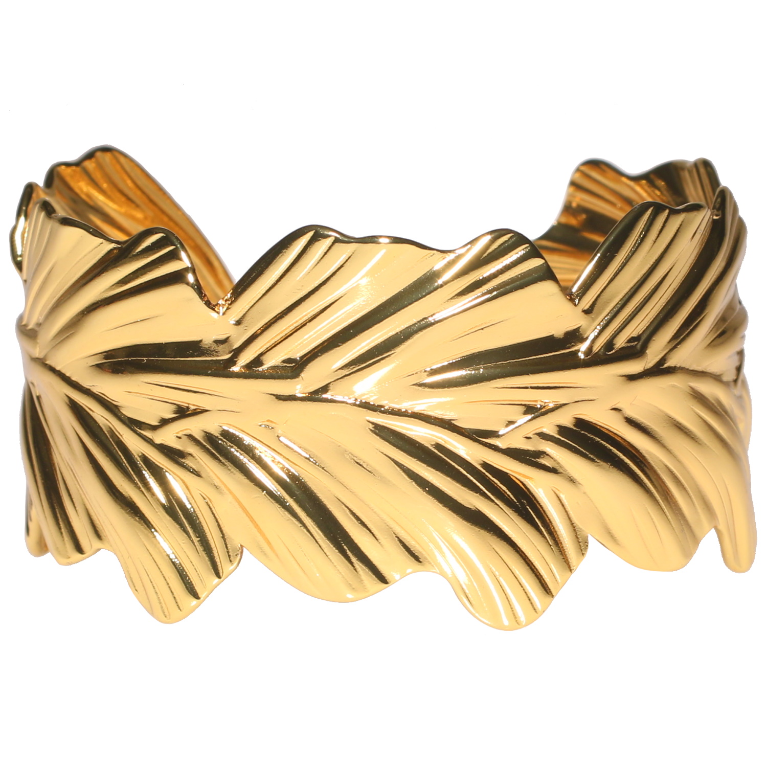 Description Bracelet manchette en forme de couronne de feuilles en acier doré. Largeur 32 mm Diamètre 58 mm [Guide des tailles] Matière(s) Acier . L'acier utilisé dans la bijouterie existe sous plusieurs qualités. Nous utilisons principalement la qualité 316L, qualité qui est utilisée en chirurgie. Cet acier est donc inoxydable et reste très résistant. Fermoir Aucun Couleur(s) dominante(s) Doré Public Adolescent , Adulte . Genre Femme , Fille . Saison Indémodable . Thème(s) Nature . Rayon en magasin TC8 Cliquez sur une matière, un thème, une couleur ou une collection pour voir tous les articles associés.