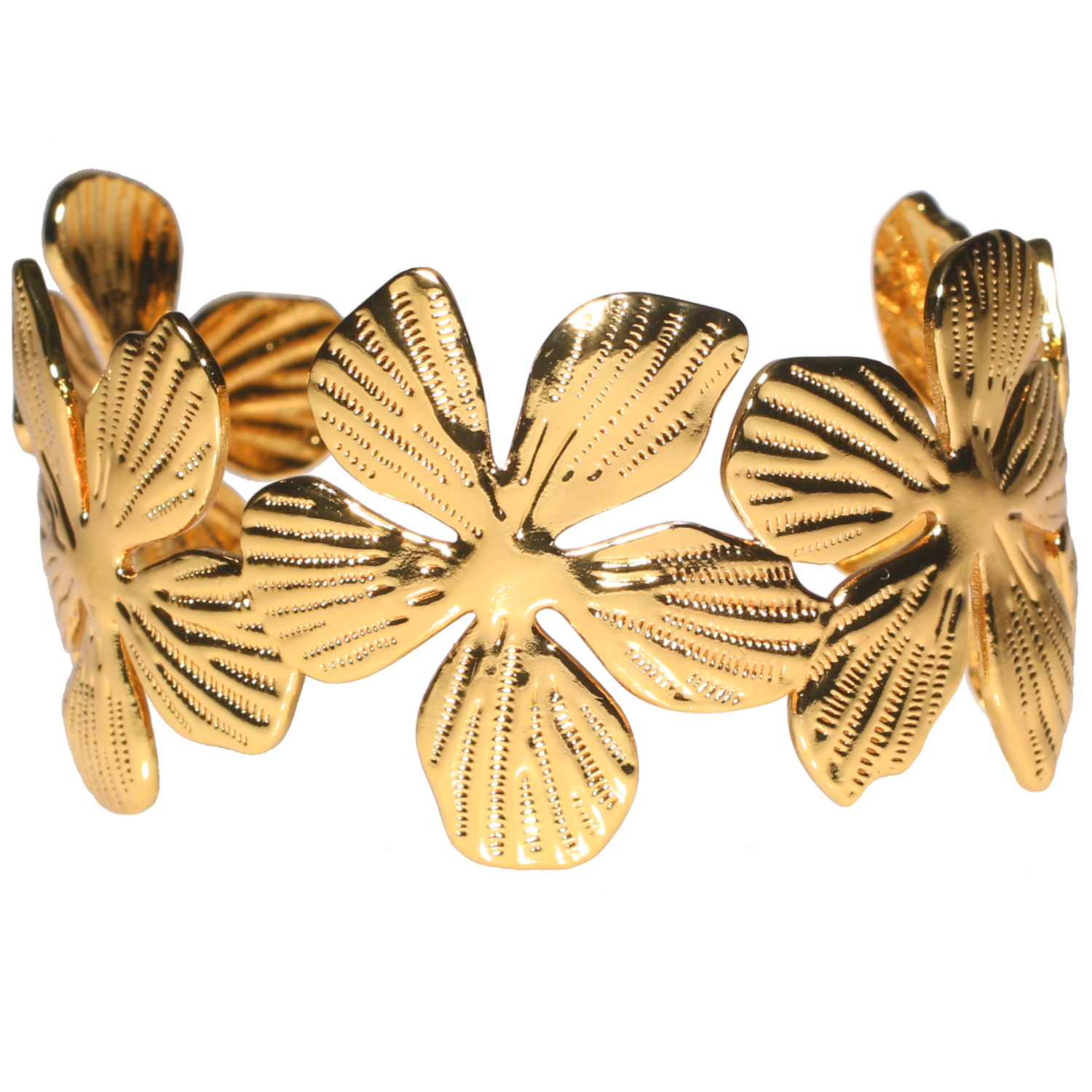 Description Bracelet manchette en forme de fleurs en acier doré. Largeur 36 mm Diamètre 58 mm [Guide des tailles] Matière(s) Acier . L'acier utilisé dans la bijouterie existe sous plusieurs qualités. Nous utilisons principalement la qualité 316L, qualité qui est utilisée en chirurgie. Cet acier est donc inoxydable et reste très résistant. Fermoir Aucun Couleur(s) dominante(s) Doré Public Adolescent , Adulte . Genre Femme , Fille . Saison Indémodable . Thème(s) Fleurs , Nature . Cliquez sur une matière, un thème, une couleur ou une collection pour voir tous les articles associés.