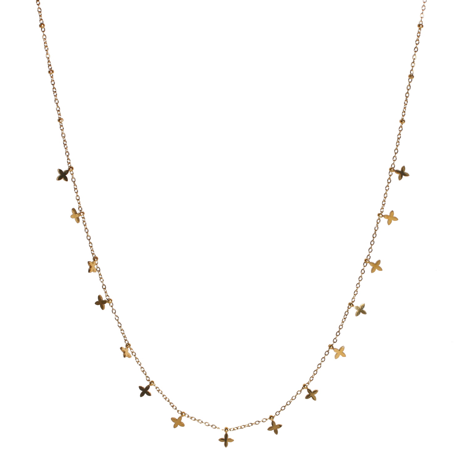 Description Collier composé d'une chaîne avec des pampilles en forme de trèfles en acier doré. Fermoir mousqueton avec 5 cm de rallonge. Cliquez sur une matière, un thème, une couleur ou une collection pour voir tous les articles associés.