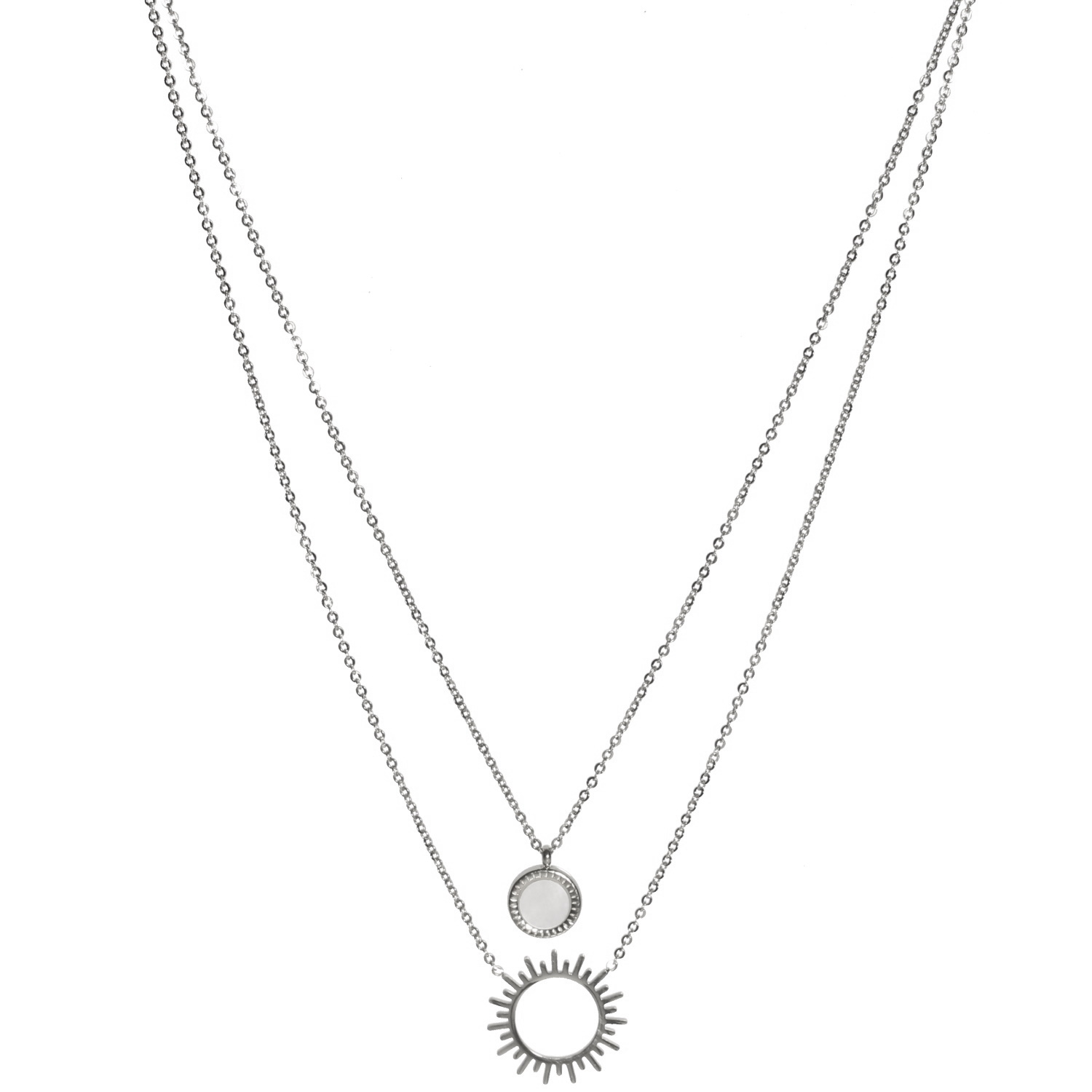 Description Collier double rangs composé d'une chaîne de 38 cm de long en acier argenté avec un pendentif rond serti de nacre, ainsi qu'une chaîne de 40 cm de long avec un pendentif cercle en forme de soleil en acier argenté. Fermoir mousqueton avec 5 cm de rallonge. Cliquez sur une matière, un thème, une couleur ou une collection pour voir tous les articles associés.