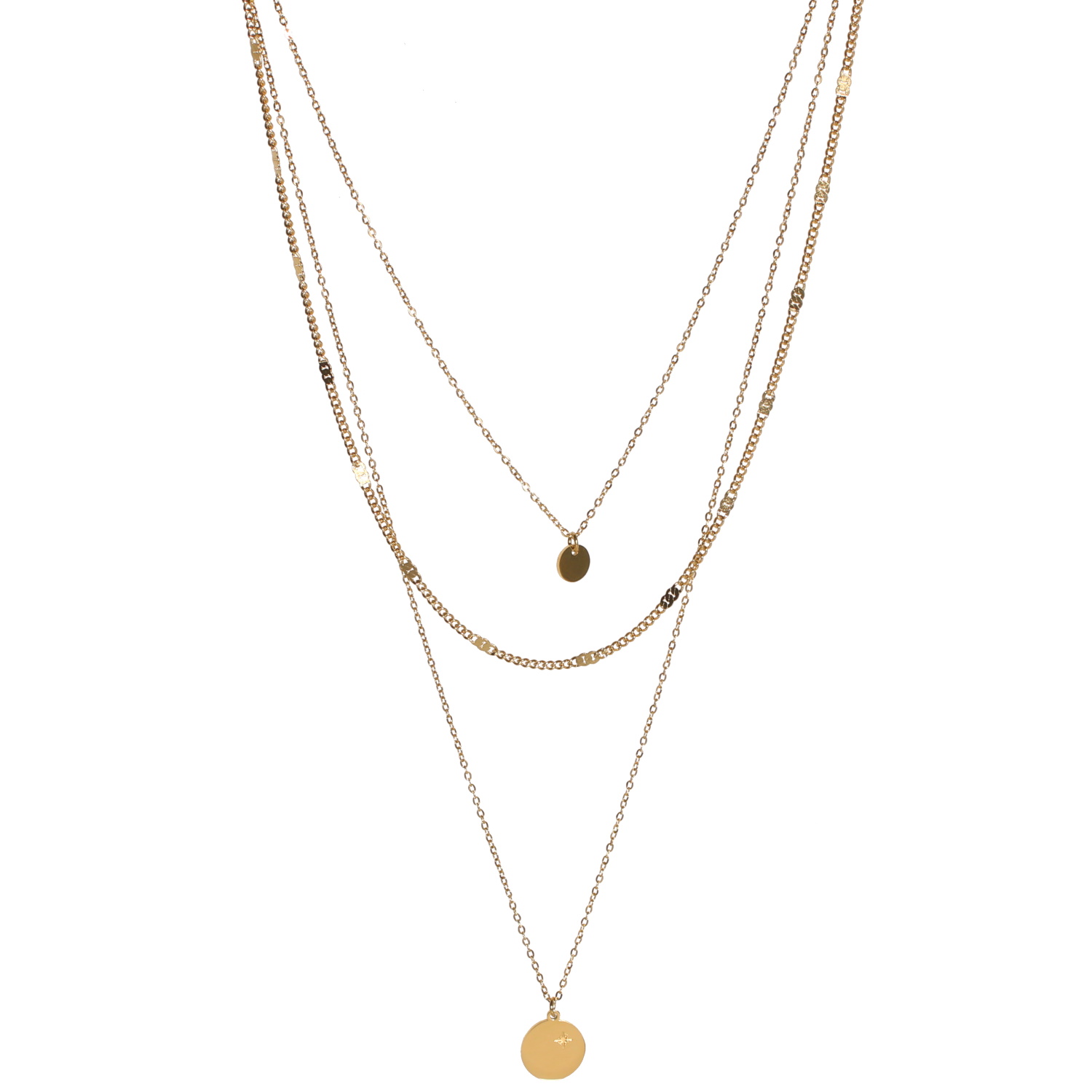 Description Collier triple rangs composé d'une chaîne de 40 cm de long avec un pendentif rond lisse en acier doré, d'une chaîne de 45 cm de long en acier doré et d'une chaîne de 56 cm de long avec un pendentif rond gravé d'une étoile en acier doré. Fermoir mousqueton avec 5 cm de rallonge. Longueur 40+5 cm [Guide des tailles] Matière(s) Acier . L'acier utilisé dans la bijouterie existe sous plusieurs qualités. Nous utilisons principalement la qualité 316L, qualité qui est utilisée en chirurgie. Cet acier est donc inoxydable et reste très résistant. Fermoir Mousqueton Couleur(s) dominante(s) Doré Public Adolescent , Adulte . Genre Femme , Fille . Saison Indémodable . Thème(s) Nature . Cliquez sur une matière, un thème, une couleur ou une collection pour voir tous les articles associés.