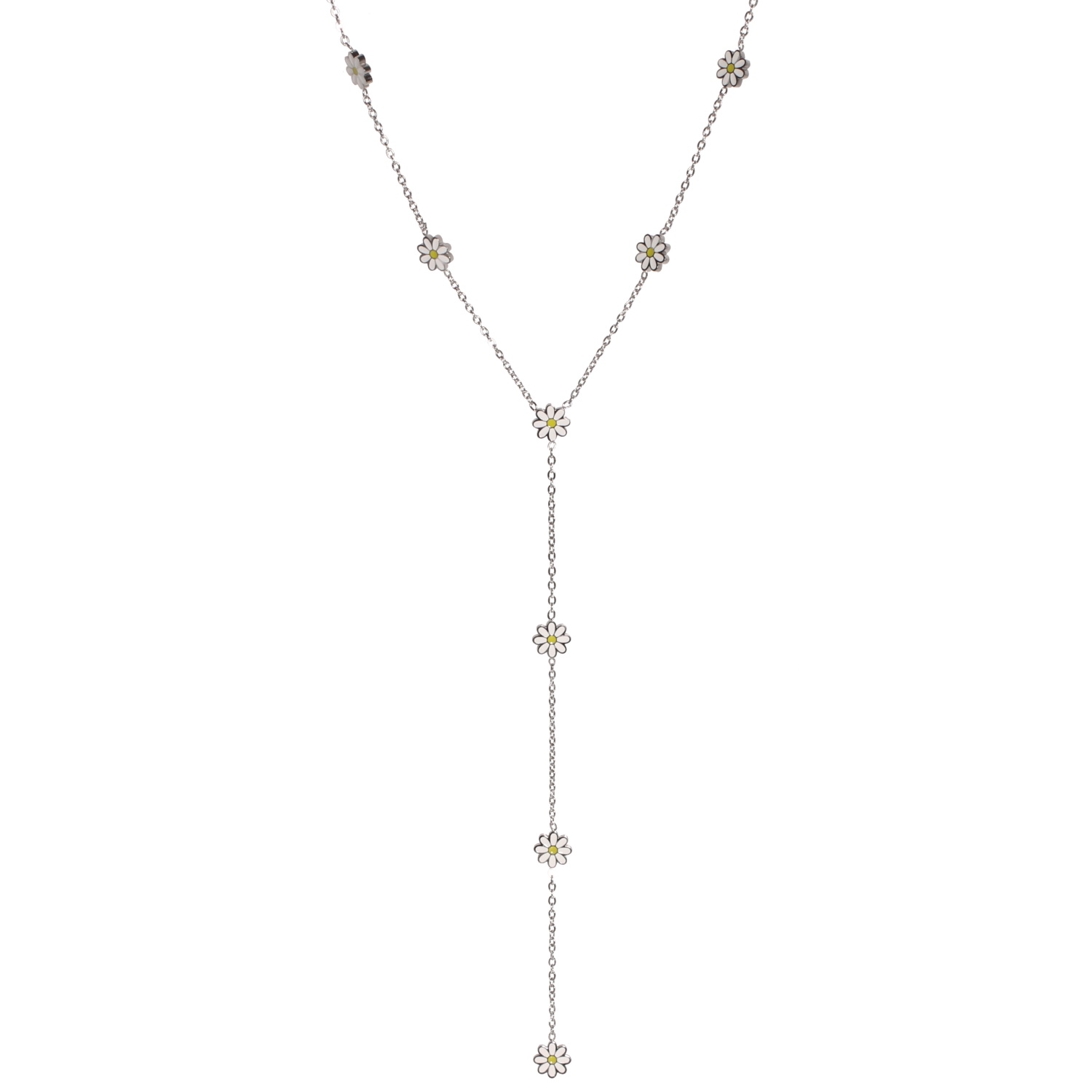 Description Collier de forme Y composé d'une chaîne en acier argenté et de fleurs pavées d'émail de couleur. Fermoir mousqueton avec 5 cm de rallonge.