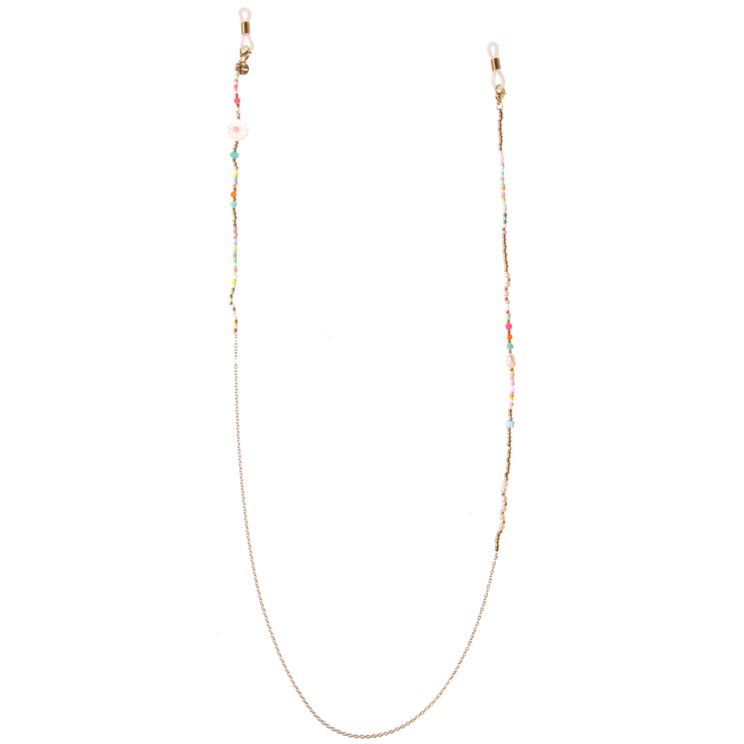 Description Cordon pour lunettes composé d'une chaîne en acier doré, de perles multicolores et d'une fleur en nacre d'imitation. Cliquez sur une matière, un thème, une couleur ou une collection pour voir tous les articles associés.