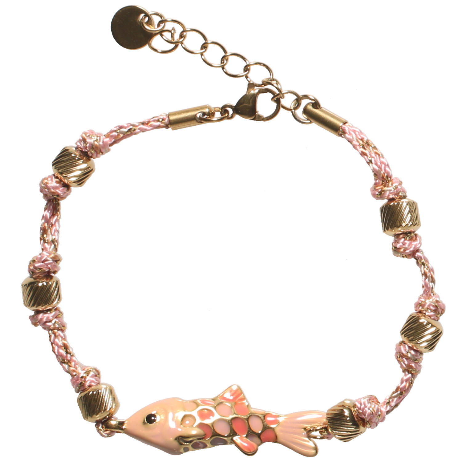 Description Bracelet composé d'un cordon de fils roses et dorés, de perles cylindres rayées en acier doré et d'un poisson pavé d'émail rose. Fermoir mousqueton en acier doré avec 3 cm de rallonge. Cliquez sur une matière, un thème, une couleur ou une collection pour voir tous les articles associés.