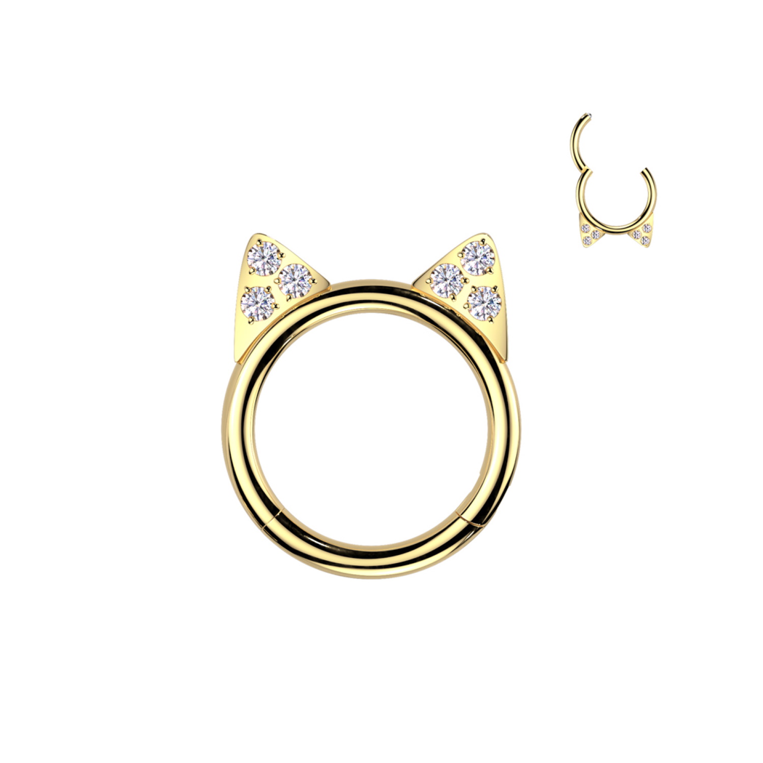 DescriptionPiercing anneau en titane doré de qualité implantaire avec des oreilles de chat pavées d'oxydes de zirconium blancs.Cliquez sur une matière, un thème, une couleur ou une collection pour voir tous les articles associés.