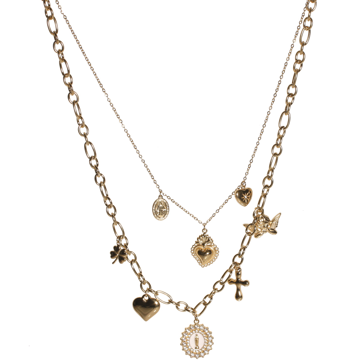 Collier double rangs composé d'une chaîne de 38 cm de long en acier doré avec des pendants en forme de médaille religieuse et de cœurs dont un serti d'un strass, ainsi qu'une chaîne de 46 cm de long en acier doré avec des pendants en forme d'ange, de croix, de cœur et de trèfle et d'une icône religieuse pavée d'émail et sertie de strass. Fermoir mousqueton avec 5 cm de rallonge.