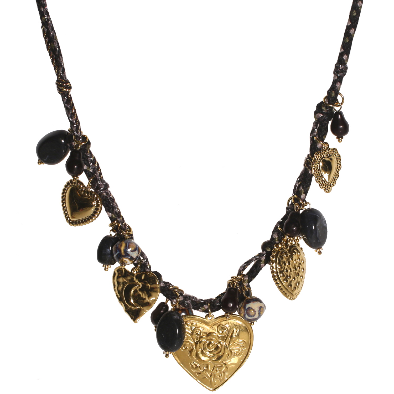 Description Collier composé de trois cordons de couleur noir, de perles noires et de pendants cœurs de différentes forme en acier doré. Fermoir mousqueton avec 5 cm de rallonge. Cliquez sur une matière, un thème, une couleur ou une collection pour voir tous les articles associés.