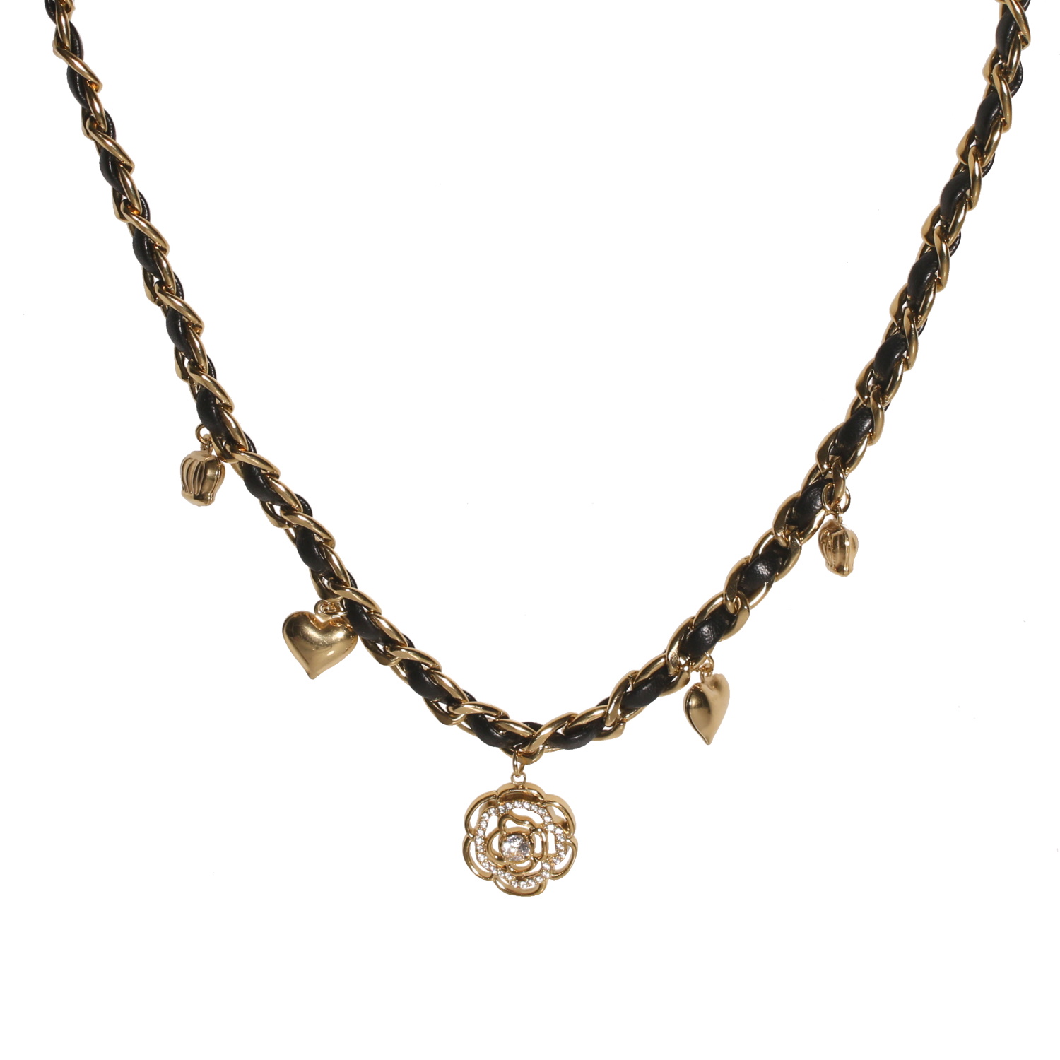 Collier ras du coup composé d'une chaîne entremêlée d'un cordon en simili cuir noir, de pendants en forme de cœur et de couronne et d'une fleur sertie de strass et d'un cristal. Fermoir mousqueton avec 10 cm de rallonge.
