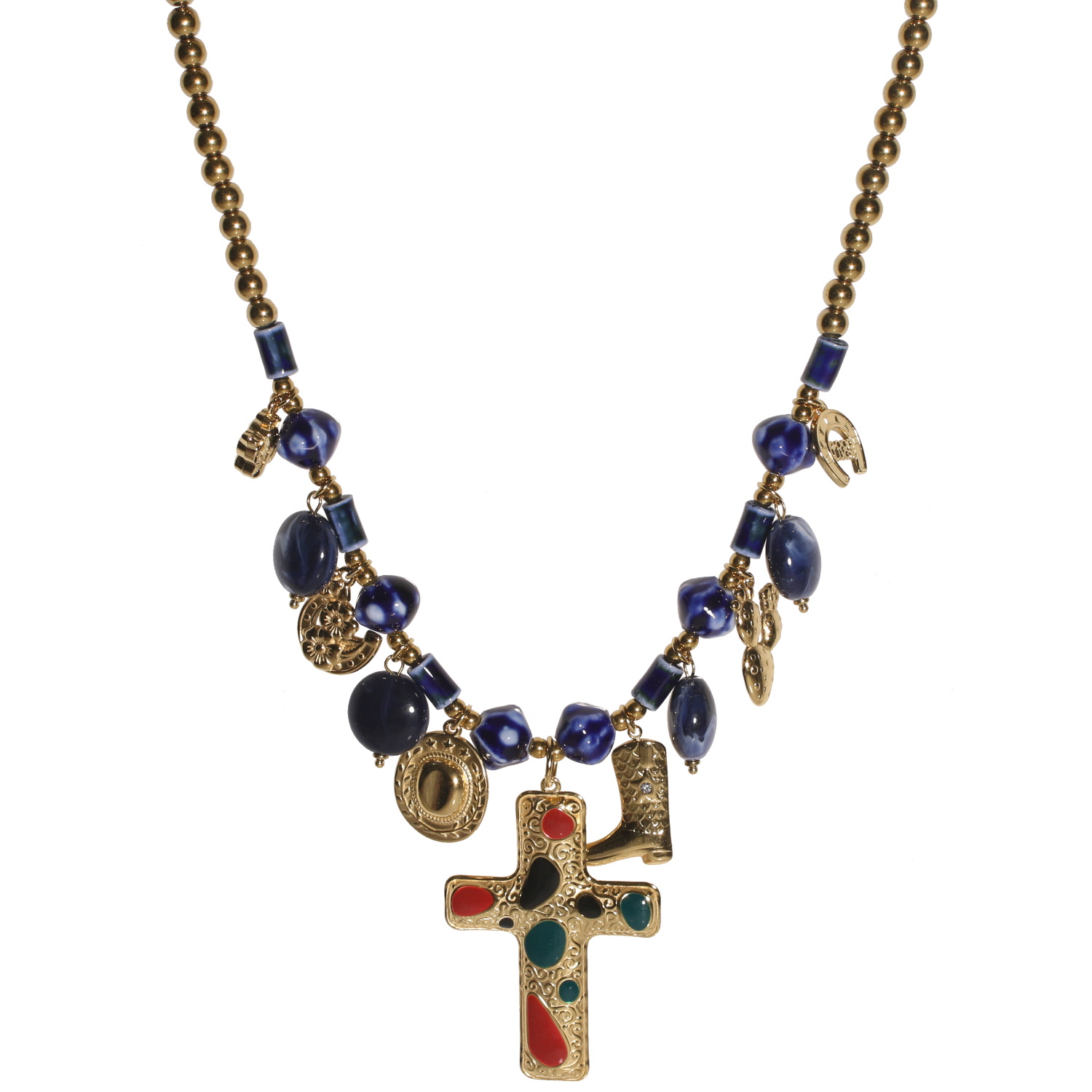 Description Collier composé d'une chaîne de perles en acier doré, de perles bleues, de pendants en forme de cactus, de fer à cheval avec fleurs, de chapeau de cowboy en acier doré, d'une botte de cowboy en acier doré sertie d'un strass et d'une croix en acier doré tachetée d'émail multicolore. Fermoir mousqueton avec 5 cm de rallonge. Longueur 43+5 cm [Guide des tailles] Matière(s) Acier , Céramique , Email , Rocaille , Verre . L'acier utilisé dans la bijouterie existe sous plusieurs qualités. Nous utilisons principalement la qualité 316L, qualité qui est utilisée en chirurgie. Cet acier est donc inoxydable et reste très résistant. Fermoir Mousqueton Couleur(s) dominante(s) Bleu , Doré Public Adolescent , Adulte . Genre Femme , Fille . Saison Indémodable . Thème(s) Fleurs , Nature , Religion , Symboles . Cliquez sur une matière, un thème, une couleur ou une collection pour voir tous les articles associés.