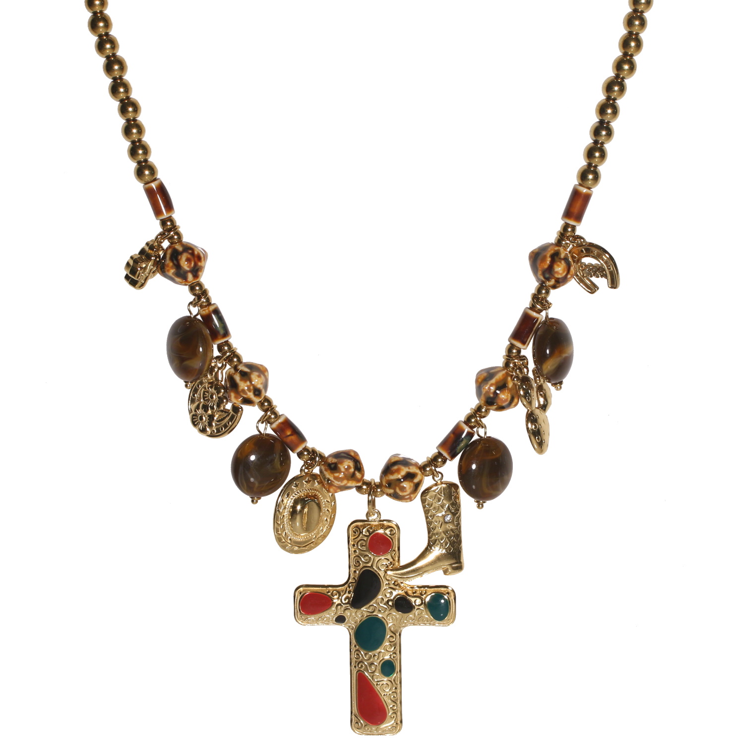 Collier composé d'une chaîne de perles en acier doré, de perles marrons, de pendants en forme de cactus, de fer à cheval avec fleurs, de chapeau de cowboy en acier doré, d'une botte de cowboy en acier doré sertie d'un strass et d'une croix en acier doré tachetée d'émail multicolore.<br/>Fermoir mousqueton avec 5 cm de rallonge.