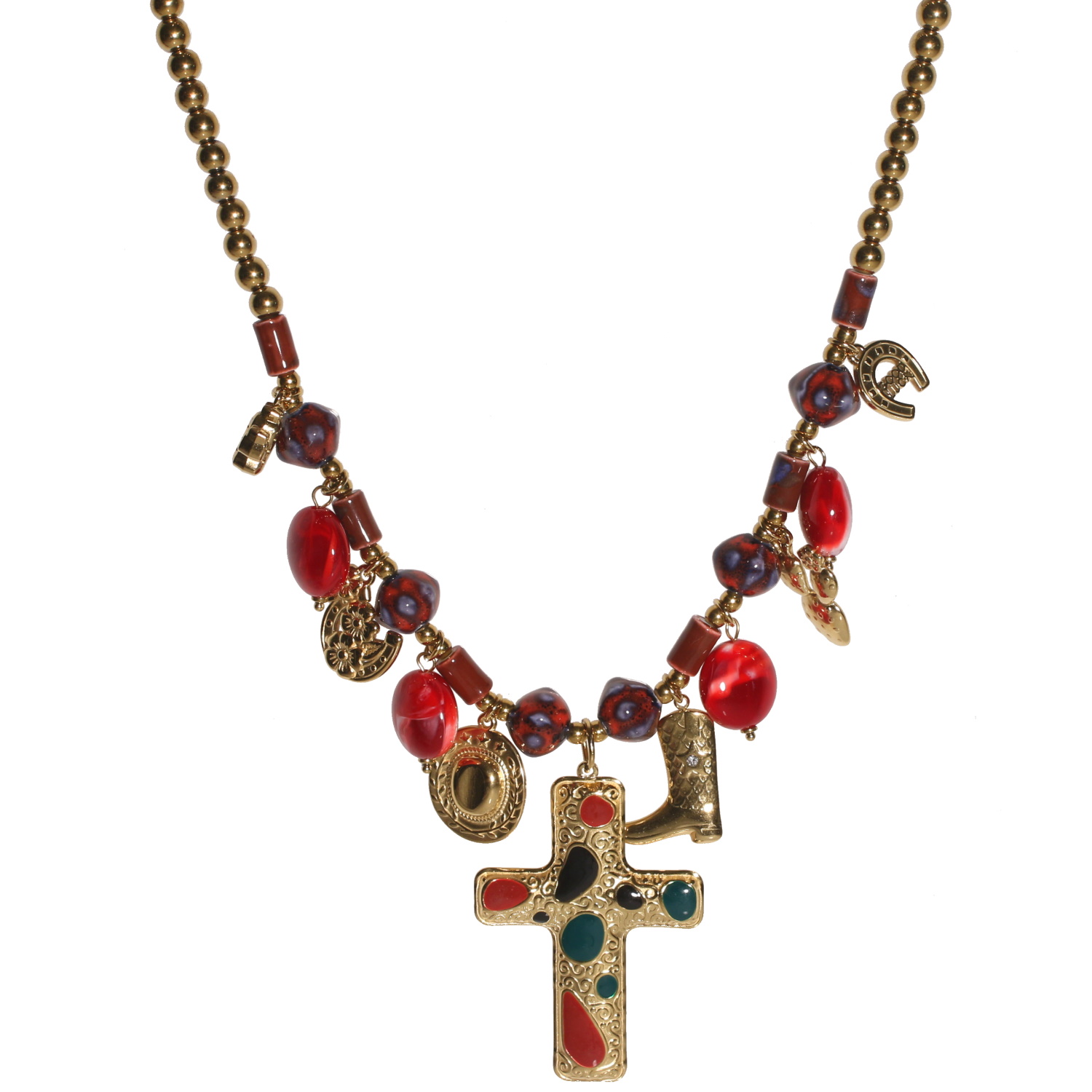 Description Collier composé d'une chaîne de perles en acier doré, de perles rouges et multicolores, de pendants en forme de cactus, de fer à cheval avec fleurs, de chapeau de cowboy en acier doré, d'une botte de cowboy en acier doré sertie d'un strass et d'une croix en acier doré tachetée d'émail multicolore. Fermoir mousqueton avec 5 cm de rallonge.