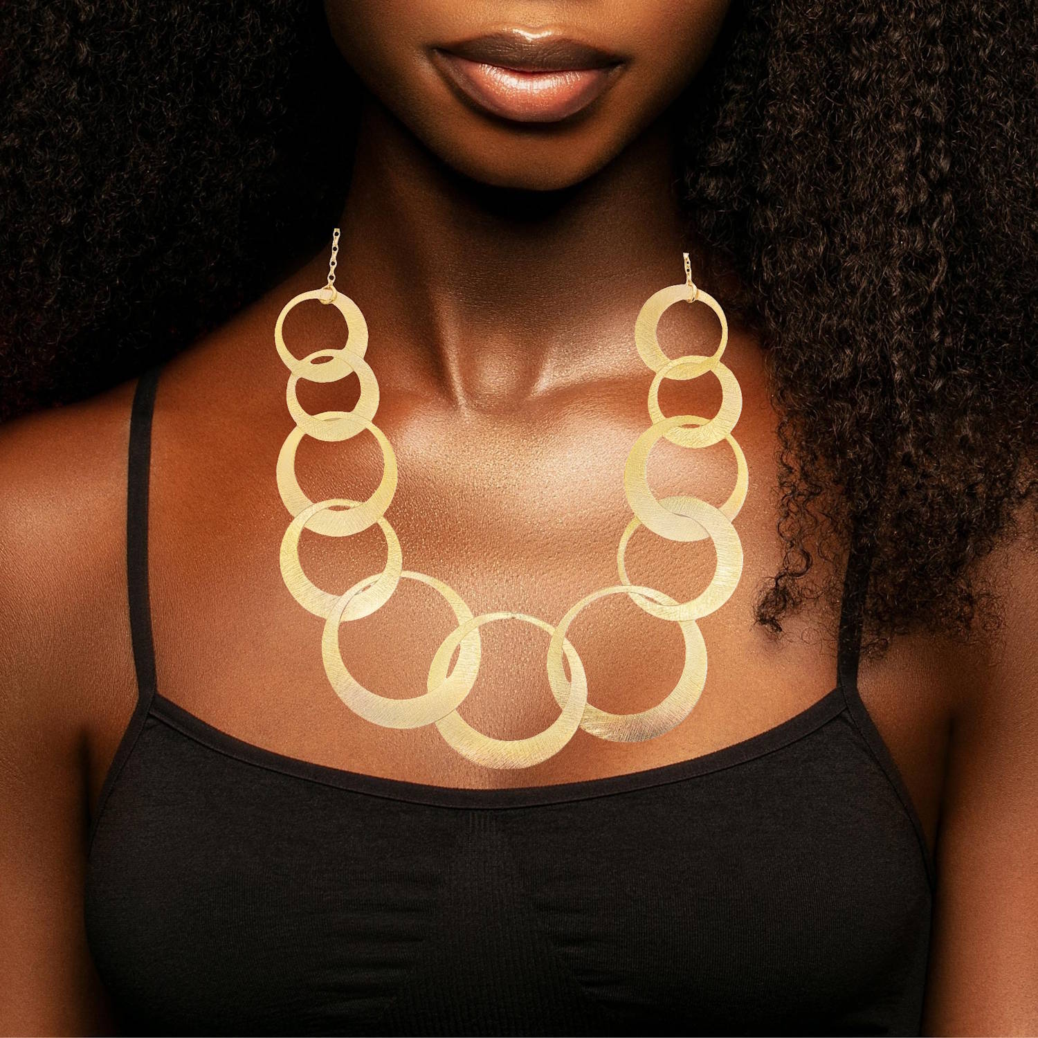 Description Ce collier chaîne en bronze est une pièce maîtresse sophistiquée. Les maillons circulaires, imbriqués avec élégance, créent un effet visuel captivant et un mouvement fluide. Le ton chaleureux du bronze illumine le décolleté, ajoutant une touche de luxe discret à toute tenue. Un accessoire intemporel, parfait pour rehausser votre style quotidien. Cliquez sur une matière, un thème, une couleur ou une collection pour voir tous les articles associés.