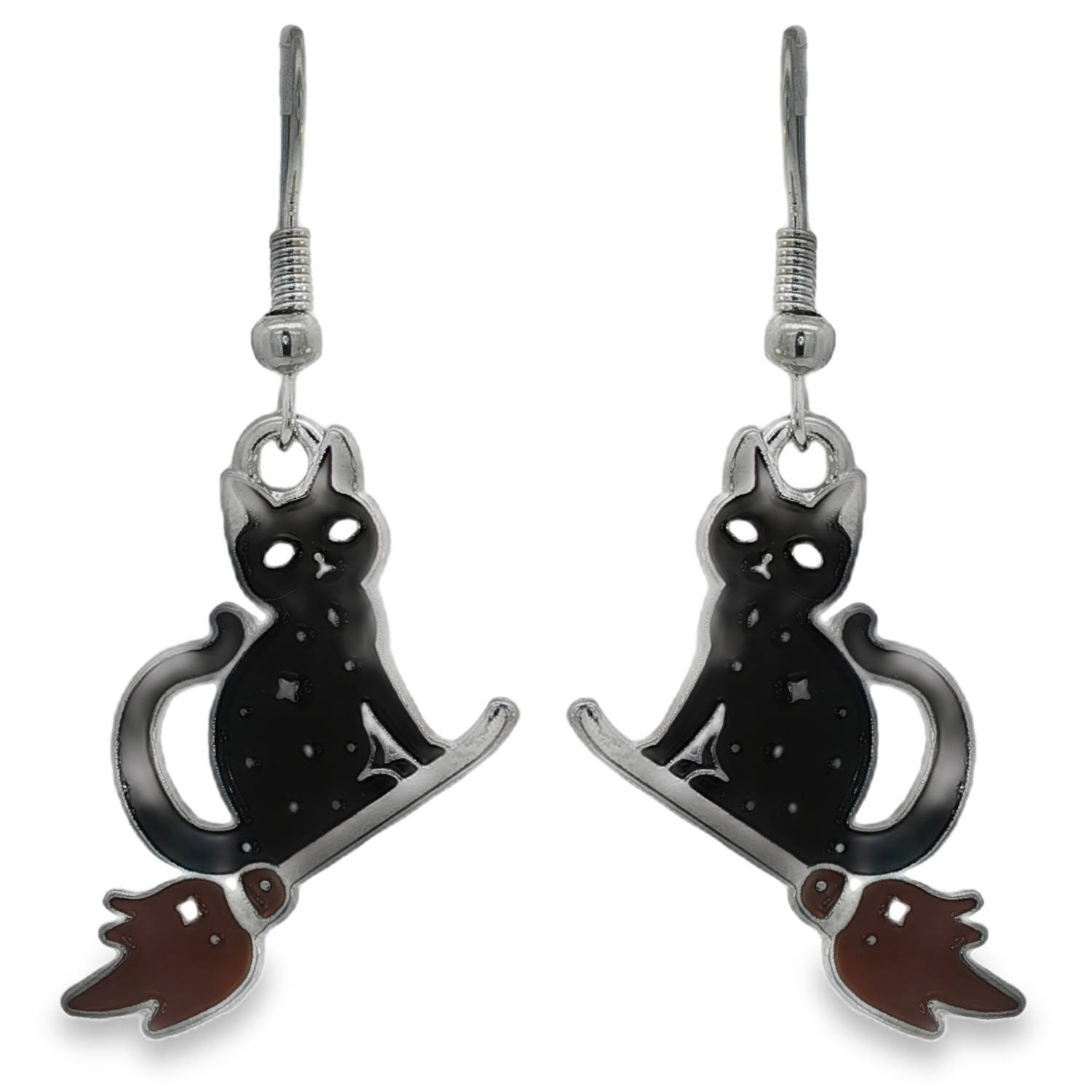 Chaque boucle présente un chat noir fantaisiste chevauchant un balai, le tout finement ouvragé en argent étincelant.
