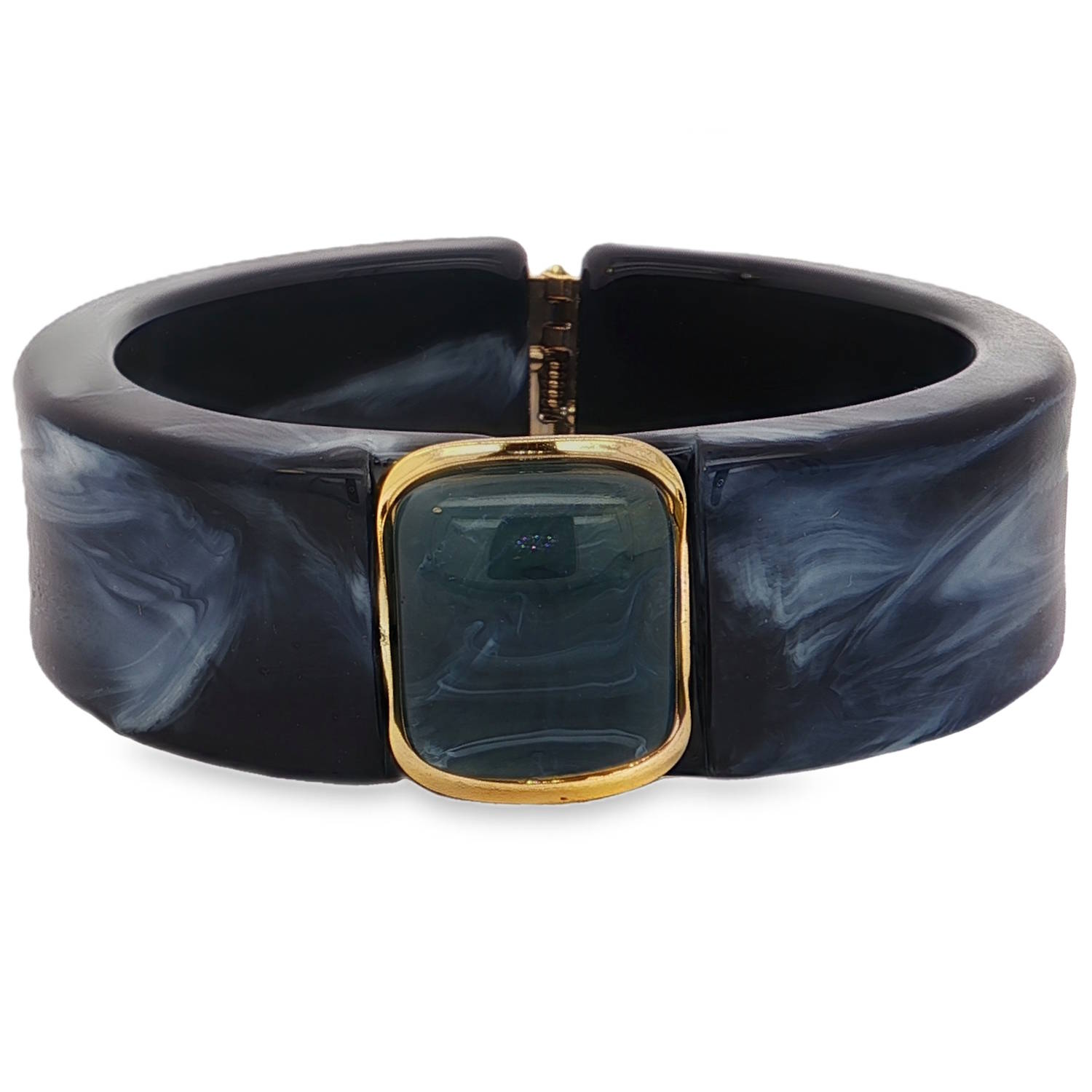 Son bracelet non métallique arbore un insert bleu taillé en cabochon carré, accentué par une monture en acier doré qui rehausse son éclat.