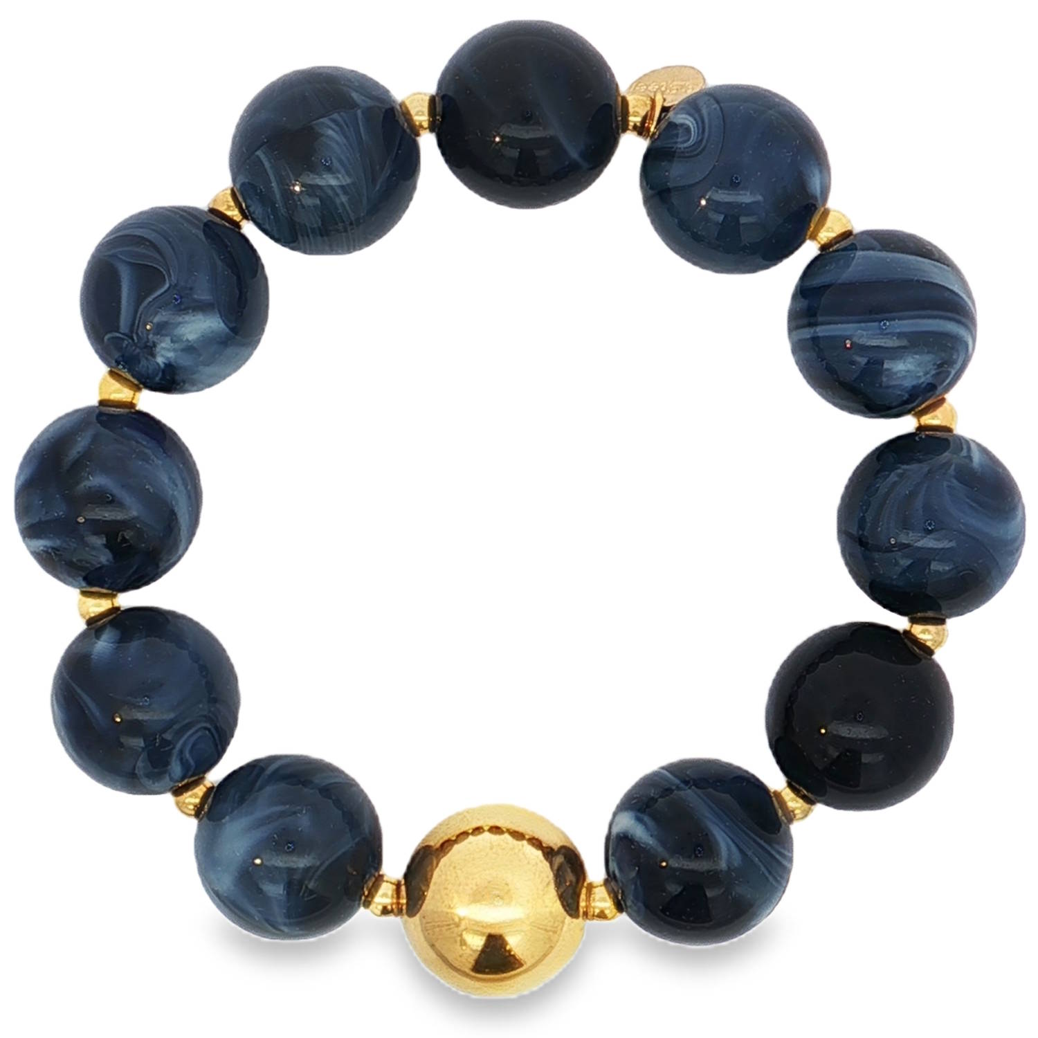 Fabriqué avec un souci du détail, il présente des perles rondes polies en tons de bleu nuancé, intercalées avec des accents dorés brillants.
