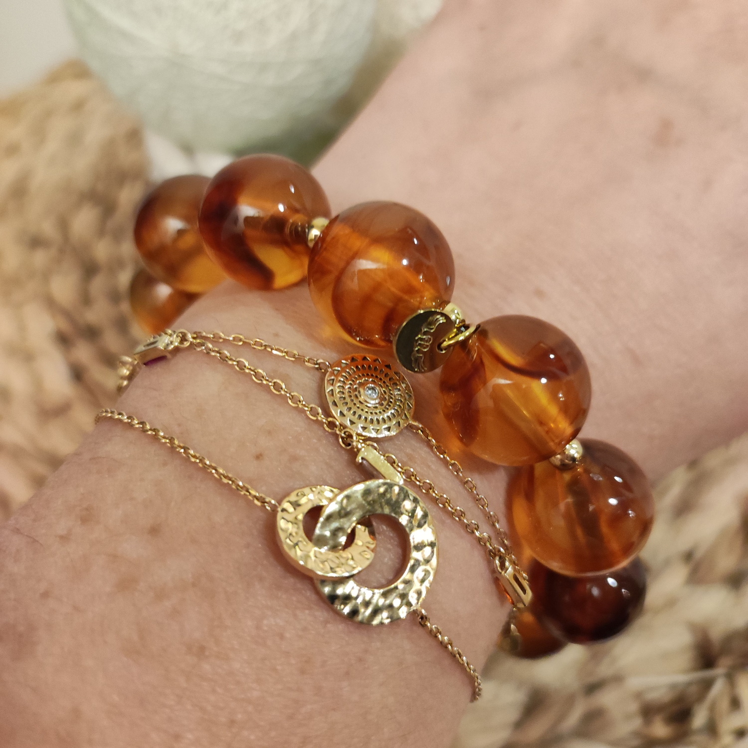 Description Rehaussez votre style avec ce bracelet élastique à perles exquis. Fabriqué avec un souci du détail, il présente des perles rondes polies en tons d'ambre, intercalées avec des accents dorés brillants. Une sphère dorée centrale ajoute une touche de luxe à ce bijou tendance. Idéal pour un usage quotidien ou pour des occasions spéciales. Longueur 16 cm [Guide des tailles] Largeur 15 mm Matière(s) Acier , Résine . L'acier utilisé dans la bijouterie existe sous plusieurs qualités. Nous utilisons principalement la qualité 316L, qualité qui est utilisée en chirurgie. Cet acier est donc inoxydable et reste très résistant. Fermoir Aucun Couleur(s) dominante(s) Doré , Marron Public Adolescent , Adulte . Genre Femme , Fille . Saison Automne , Hiver . Cliquez sur une matière, un thème, une couleur ou une collection pour voir tous les articles associés.