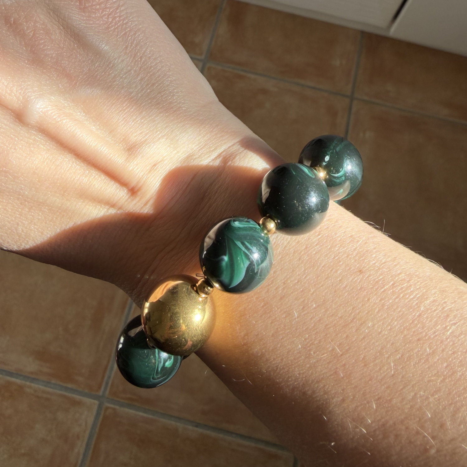 Description Rehaussez votre style avec ce bracelet élastique à perles exquis. Fabriqué avec un souci du détail, il présente des perles rondes polies en tons vert nuancé, intercalées avec des accents dorés brillants. Une sphère dorée centrale ajoute une touche de luxe à ce bijou tendance. Idéal pour un usage quotidien ou pour des occasions spéciales. Longueur 16 cm [Guide des tailles] Largeur 15 mm Matière(s) Acier , Résine . L'acier utilisé dans la bijouterie existe sous plusieurs qualités. Nous utilisons principalement la qualité 316L, qualité qui est utilisée en chirurgie. Cet acier est donc inoxydable et reste très résistant. Fermoir Aucun Couleur(s) dominante(s) Doré , Vert Public Adolescent , Adulte . Genre Femme , Fille . Saison Automne , Hiver . Cliquez sur une matière, un thème, une couleur ou une collection pour voir tous les articles associés.