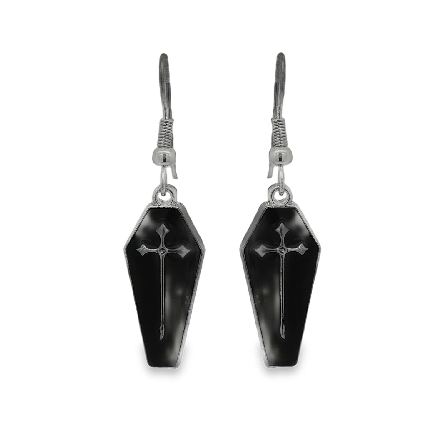 Adoptez un style gothique avec ces boucles d'oreilles pendantes argentées, arborant un motif de cercueil orné d'une croix.
