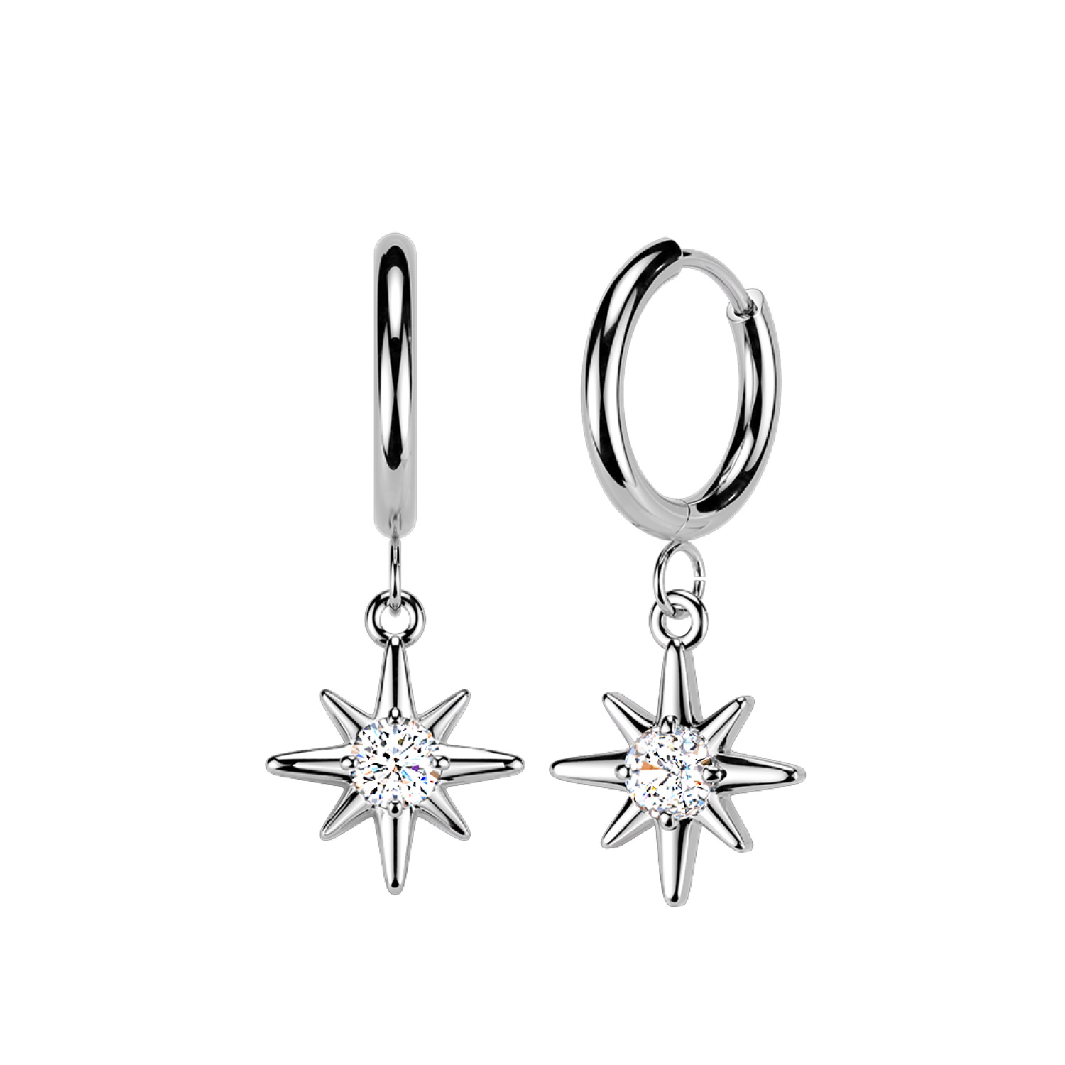 Boucles d'oreilles créoles en acier chirurgical 316L argenté avec un pendant en forme d'étoile sertie d'un oxyde de zirconium.