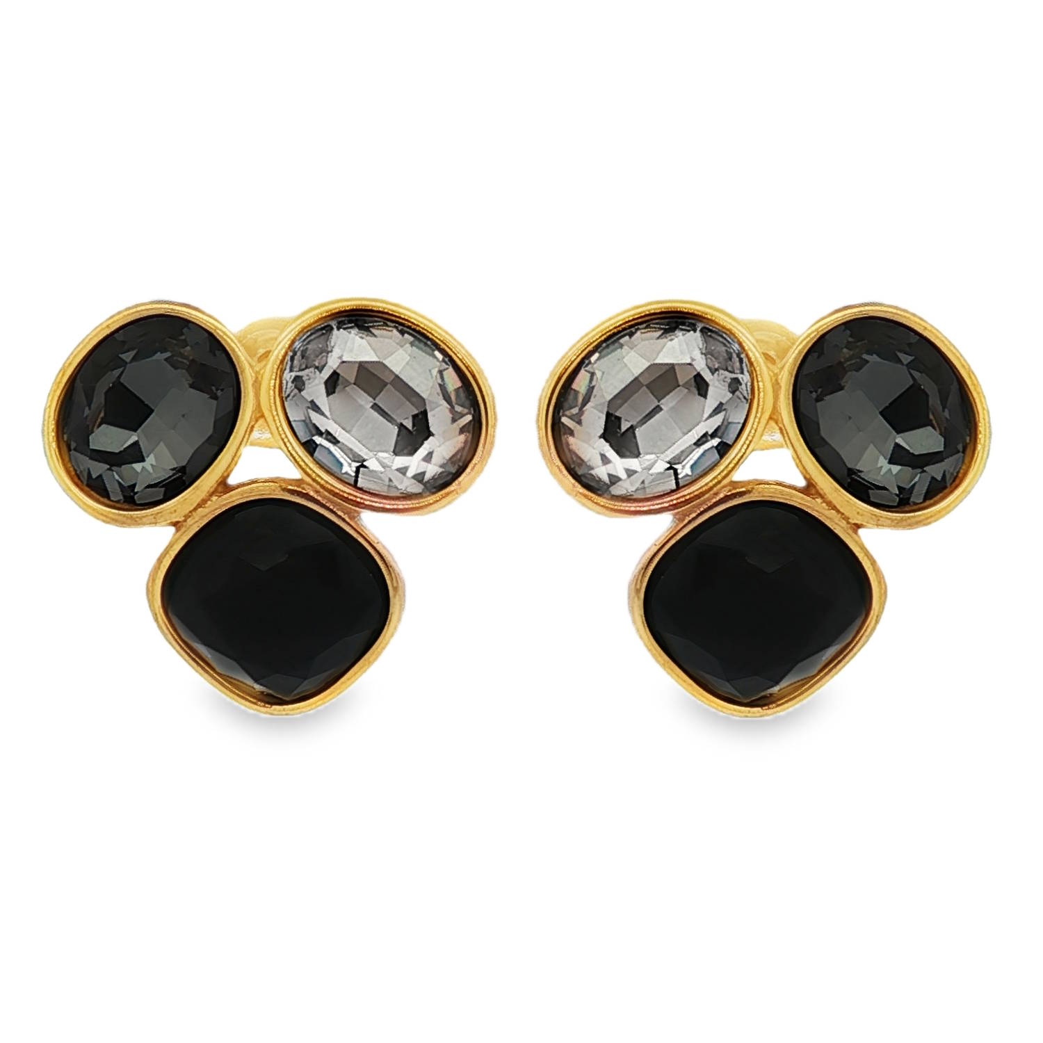 Sublimes boucles d'oreilles en acier doré, illuminés par un trio de cristaux noir et gris.