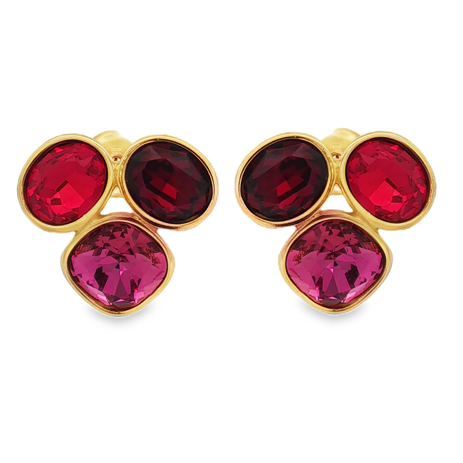 Sublimes boucles d'oreilles en acier doré, illuminés par un trio de cristaux rouge et rose.