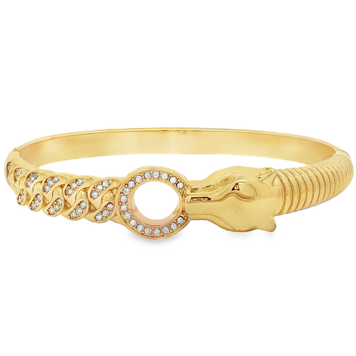 Ce bracelet jonc en acier doré, un symbole d'élégance raffinée, se distingue par son design audacieux orné de strass taille brillant.