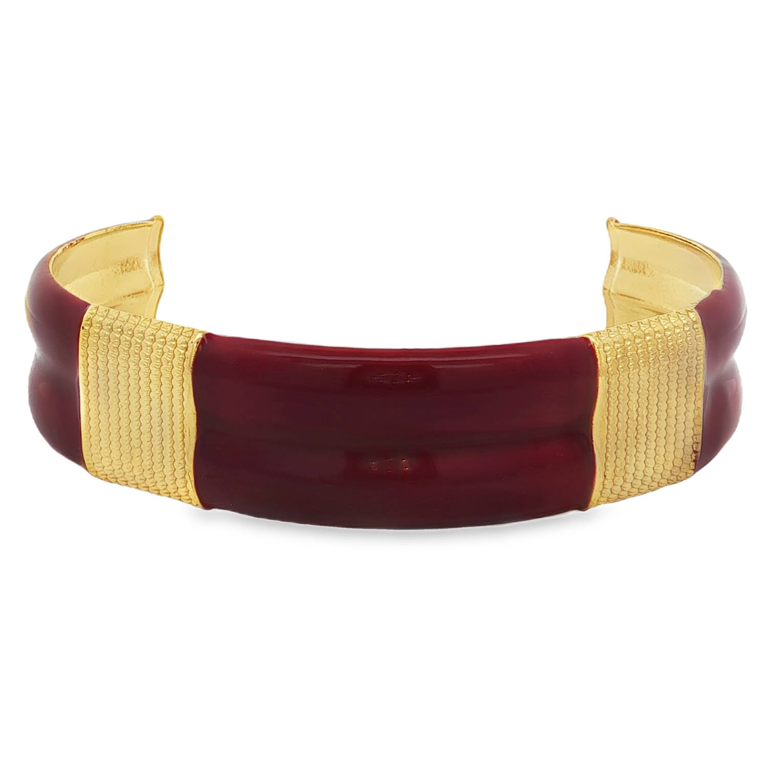 Ce bracelet jonc, arborant une finition rouge élégante et des accents dorés, est un accessoire de mode saisissant.