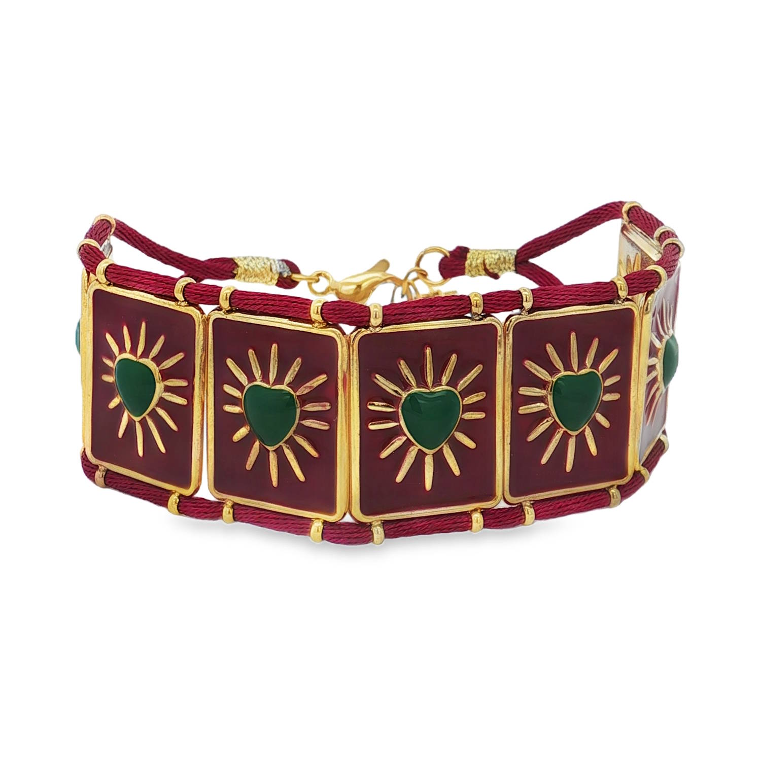 La base en cordon rouge se pare de détails dorés qui illuminent chaque motif.