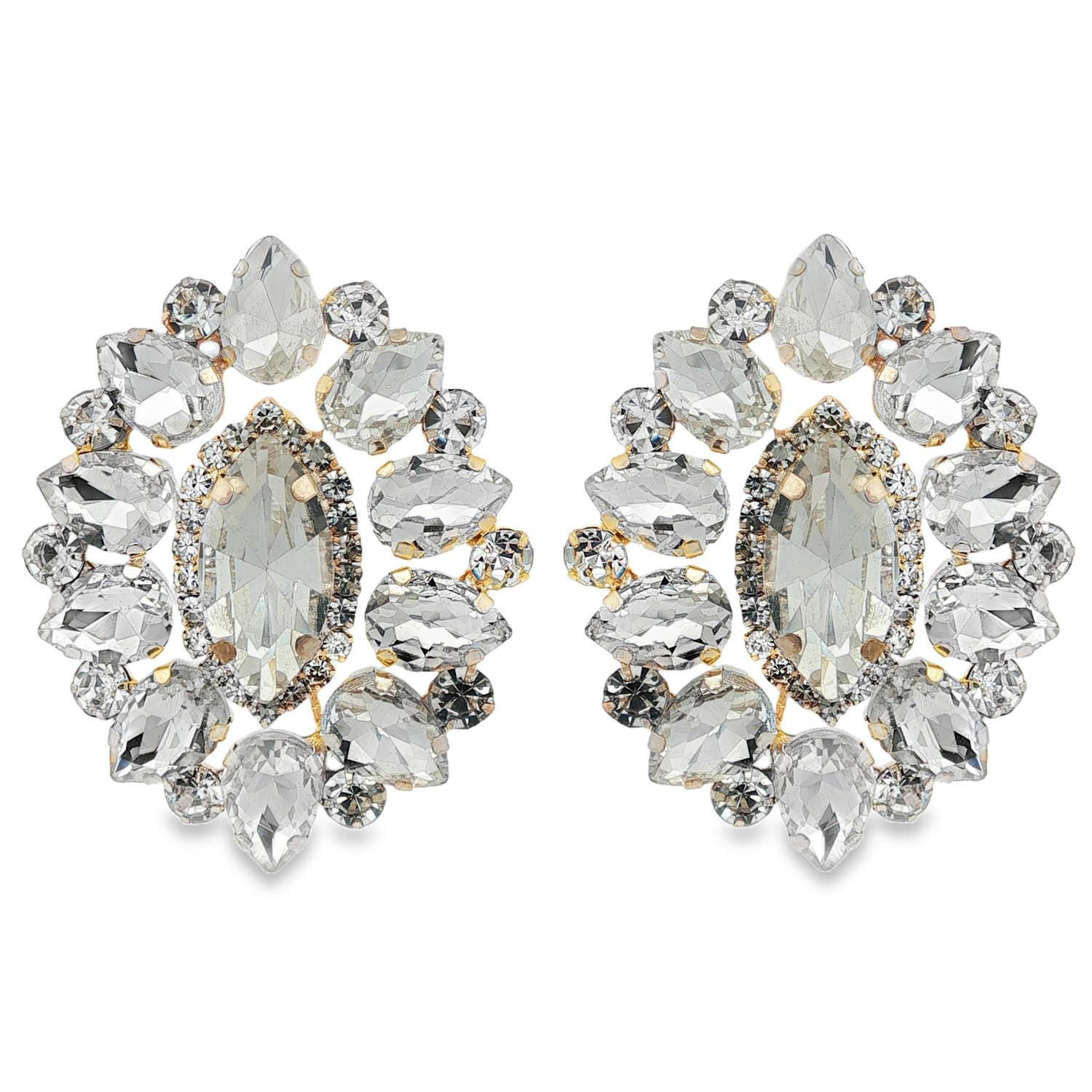 Description Élégantes boucles d'oreilles en métal doré, ornée d'un cristal ovale de taille brillant, offrant une clarté exceptionnelle. Cette pièce raffinée est conçue avec une symétrie parfaite et un poli brillant, capturant la lumière sous tous les angles. Son arrangement complexe de multiples cristaux ajoute une touche de luxe et de sophistication, parfaite pour rehausser toute tenue avec une brillance subtile. Cliquez sur une matière, un thème, une couleur ou une collection pour voir tous les articles associés.