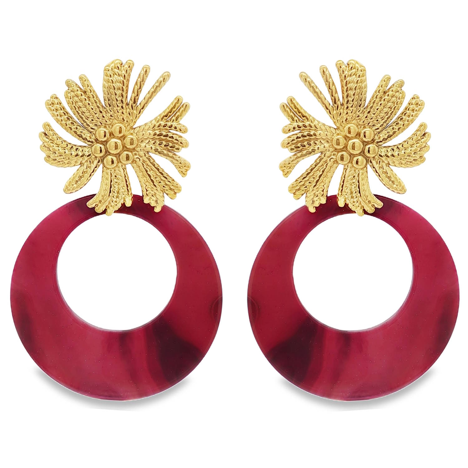 Description Rehaussez votre style avec ces boucles d'oreilles pendantes audacieuses. Elles présentent une fleur texturée en acier doré sur un cercle rouge moucheté, un design accrocheur et tendance. L'alliage de matériaux non métalliques offre un confort optimal tout en assurant un éclat durable. Accessoire idéal pour sublimer une tenue décontractée ou compléter une allure sophistiquée. Largeur 42 mm Hauteur 66 mm Matière(s) Acier , Résine . L'acier utilisé dans la bijouterie existe sous plusieurs qualités. Nous utilisons principalement la qualité 316L, qualité qui est utilisée en chirurgie. Cet acier est donc inoxydable et reste très résistant. Fermoir Tiges poussettes Couleur(s) dominante(s) Doré , Rouge Public Adolescent , Adulte . Genre Femme , Fille . Saison Indémodable . Thème(s) Fleurs , Nature . Collection Noël Cliquez sur une matière, un thème, une couleur ou une collection pour voir tous les articles associés.