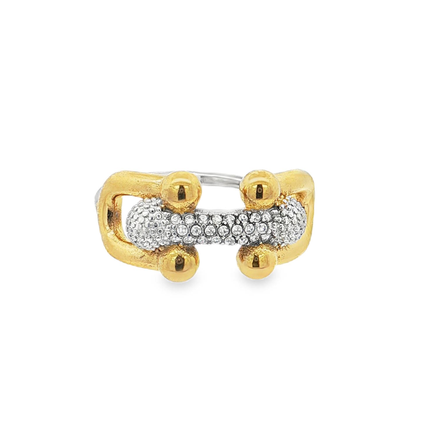 Élégante bague en acier doré et argenté, rehaussée de strass incolores taille brillant.