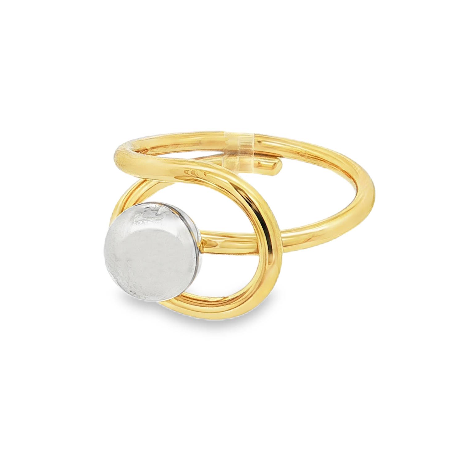 Cette bague audacieuse, confectionnée en acier doré éclatant, arbore un design contemporain unique.