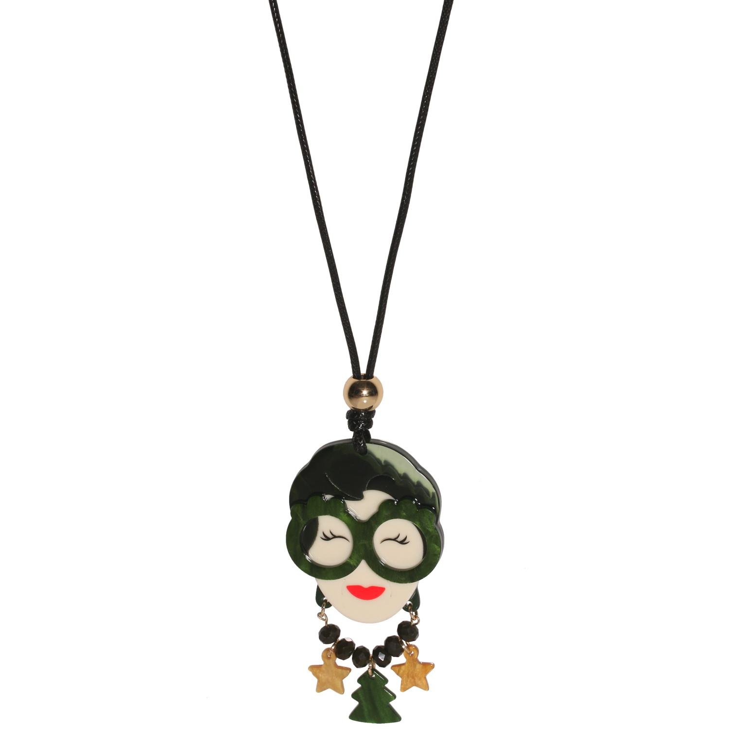 Collier sautoir fantaisie composé d'un cordon en coton ciré noir et d'un pendentif représentant une femme avec des perles rondes, des étoiles et un sapin de Noël.