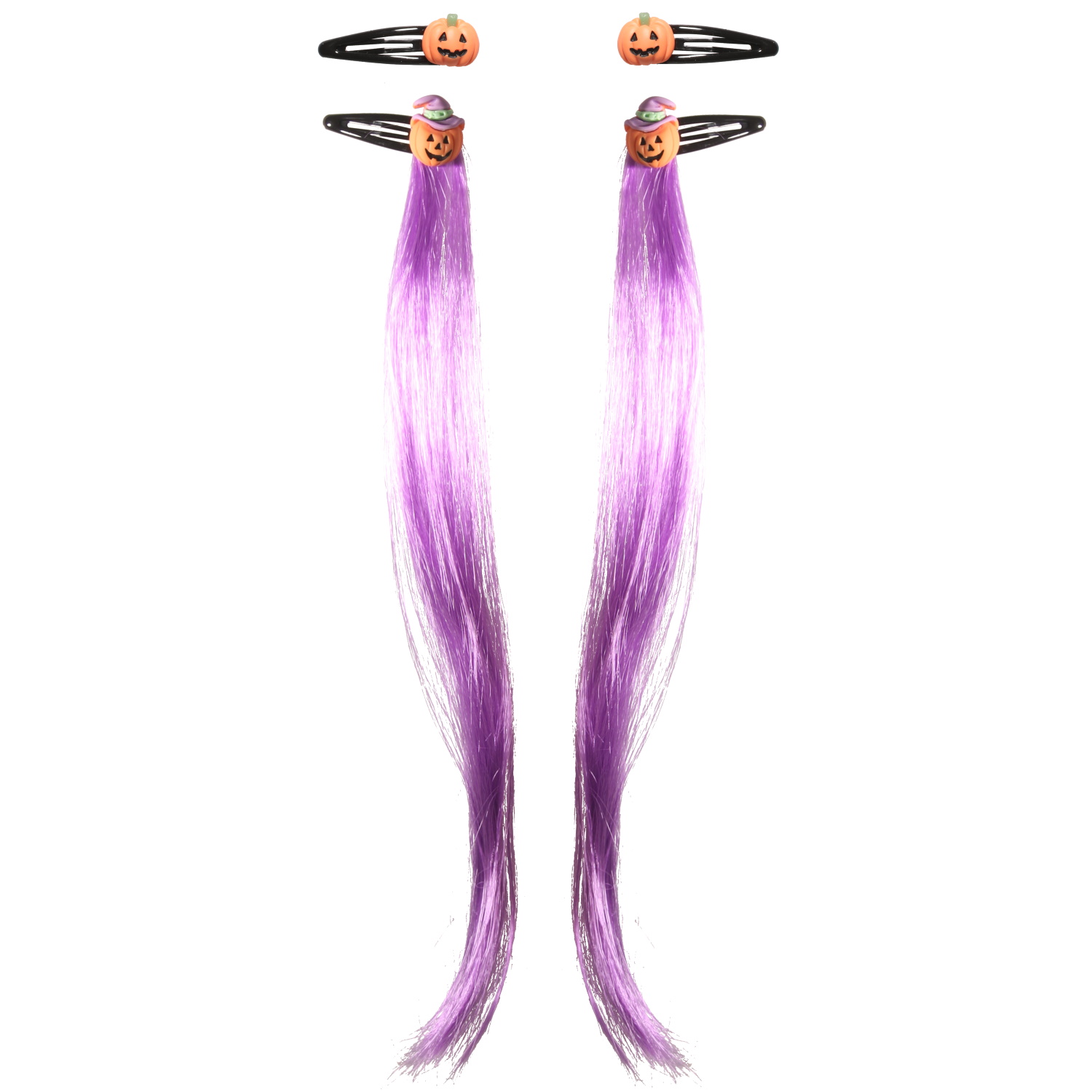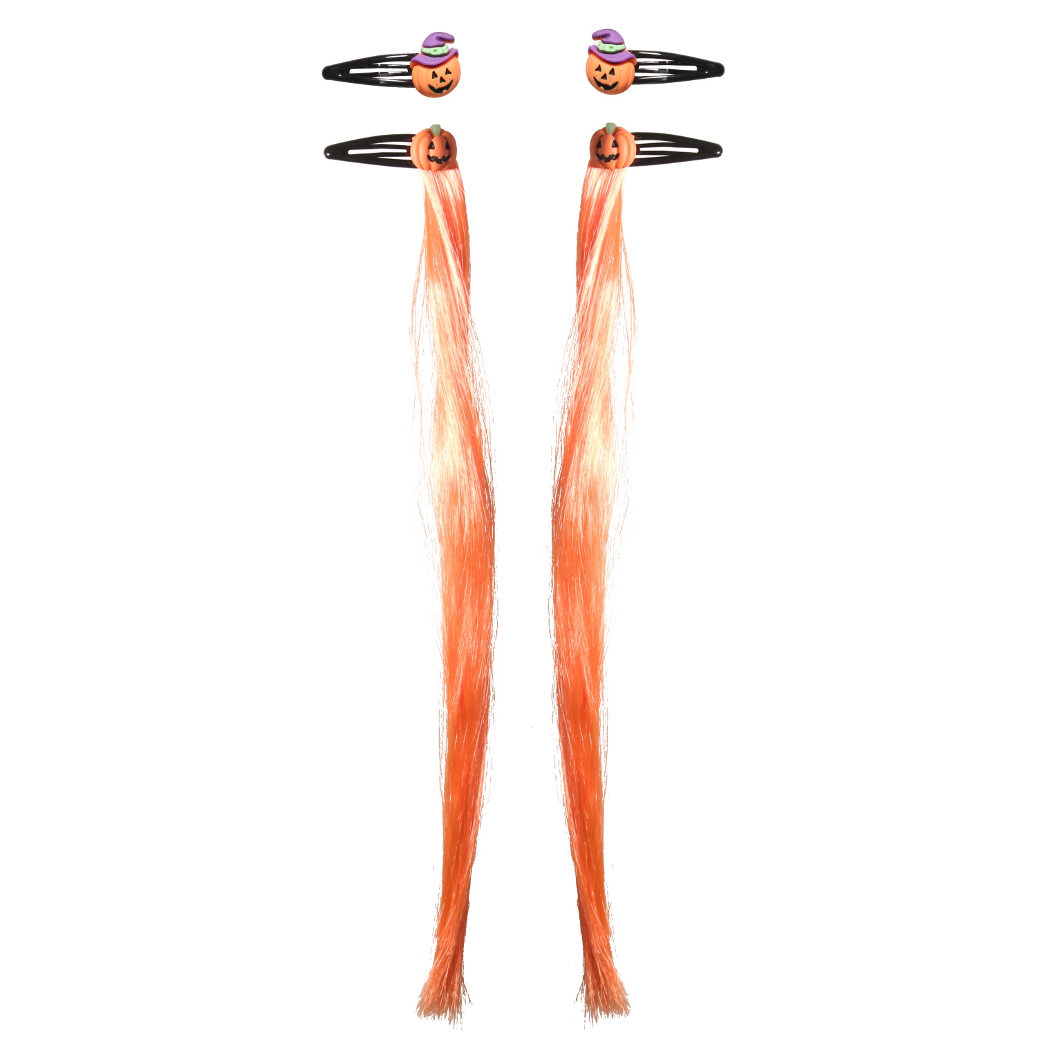 Lot de 4 barrettes pour cheveux pour Halloween avec têtes de citrouille et fausses mèches de cheveux de couleur.