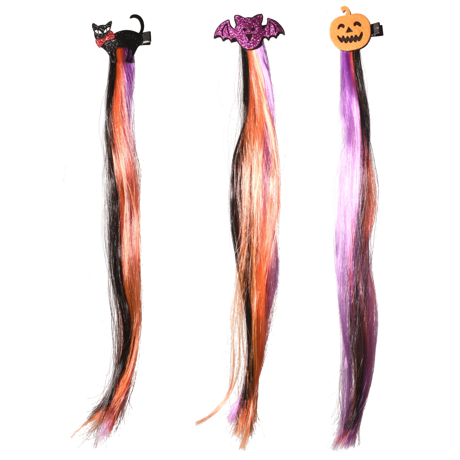 Lot de 2 barrettes pour cheveux pour Halloween avec chauve souris, chat et citrouille et fausses mèches de cheveux multicolores.
