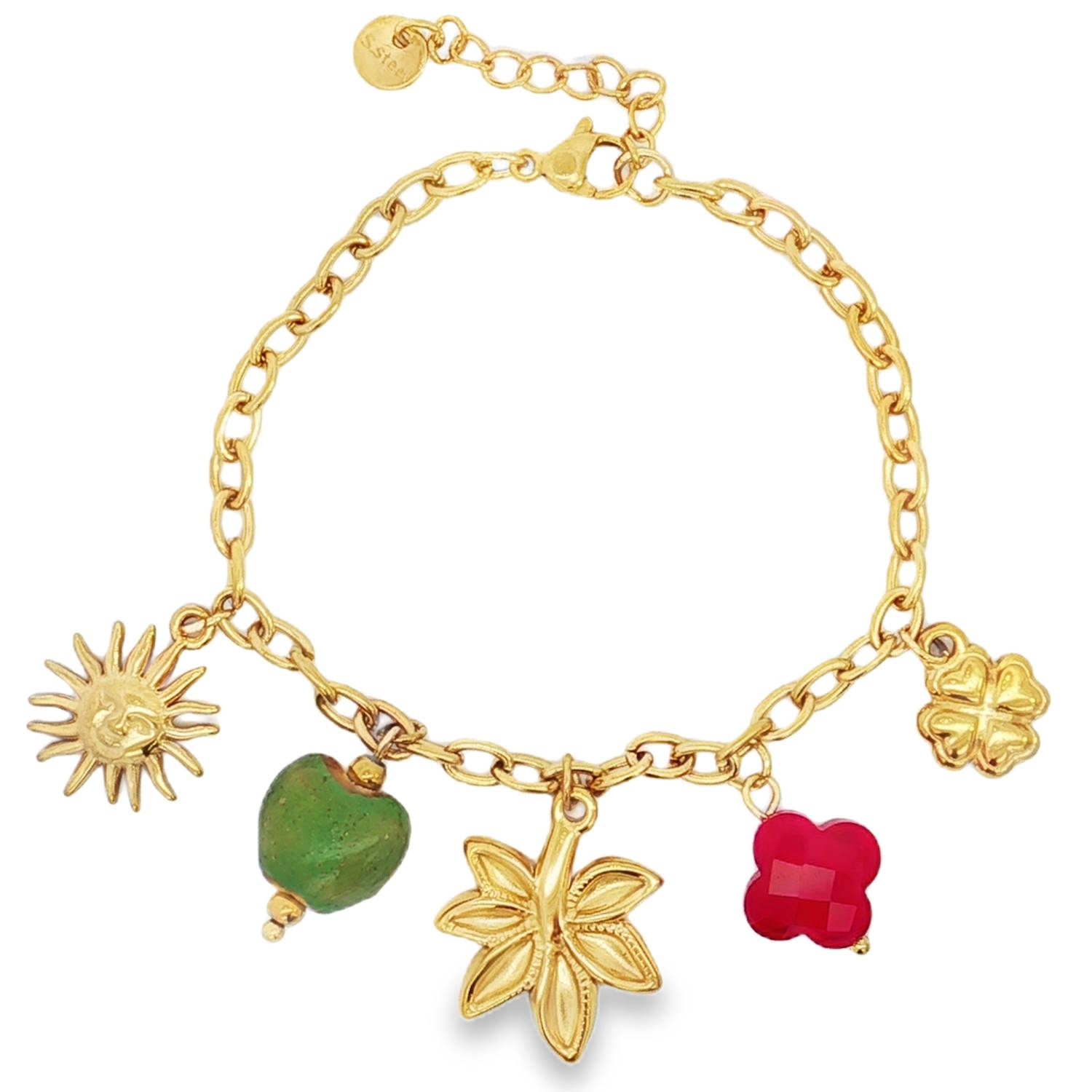 Ce bracelet à breloques en acier doré incarne un style ludique et élégant.