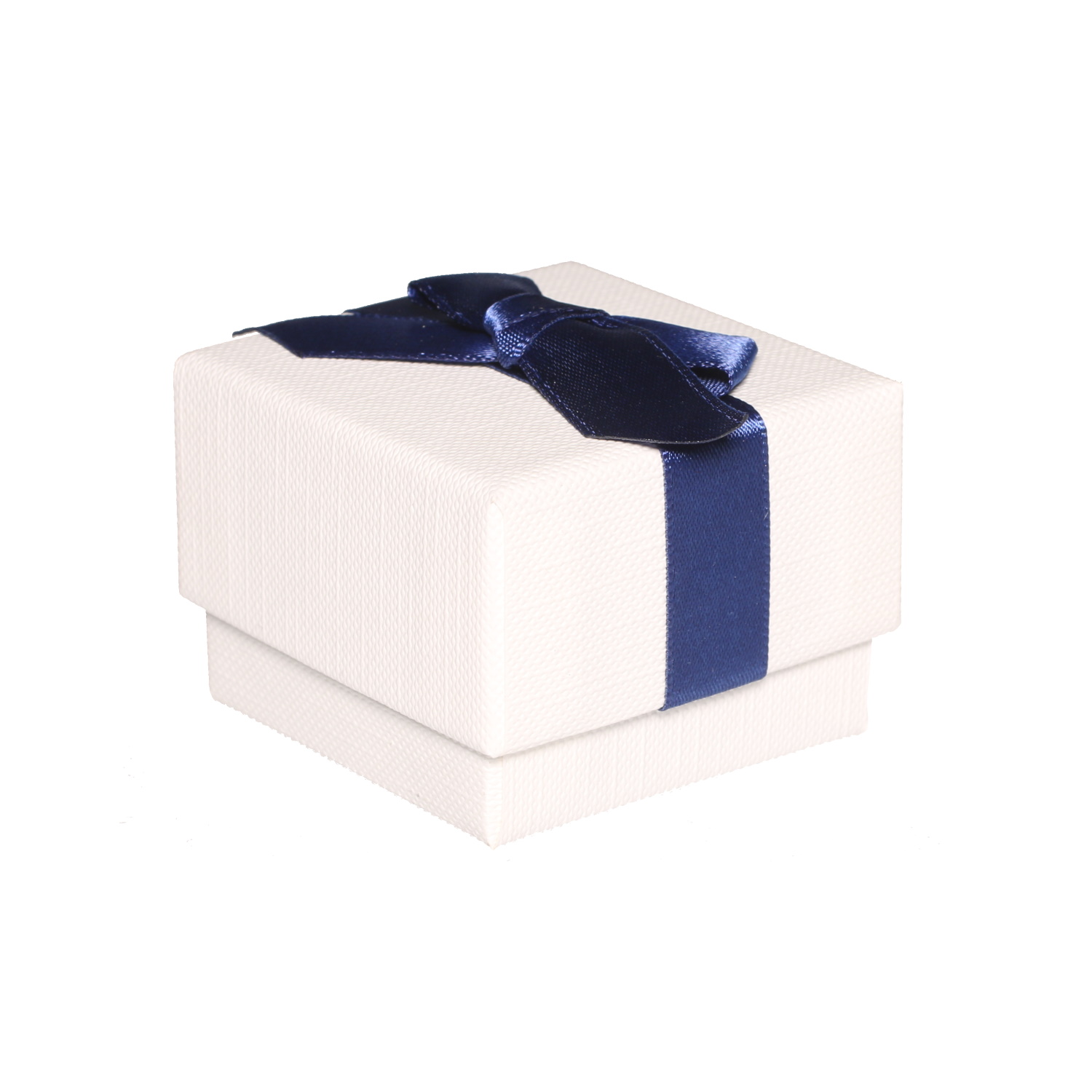 Boîte cadeau écrin pour bague ou boucles d'oreilles de couleur blanche avec un nœud papillon bleu.