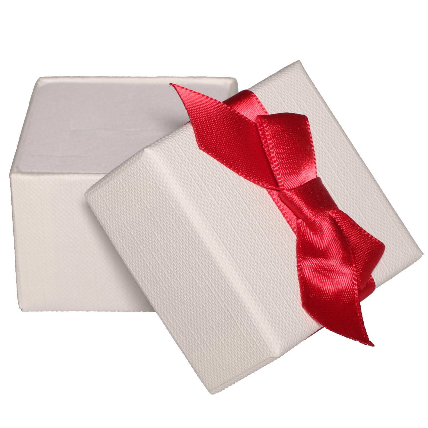 Boîte cadeau écrin pour bague ou boucles d'oreilles de couleur blanche avec un nœud papillon rouge.