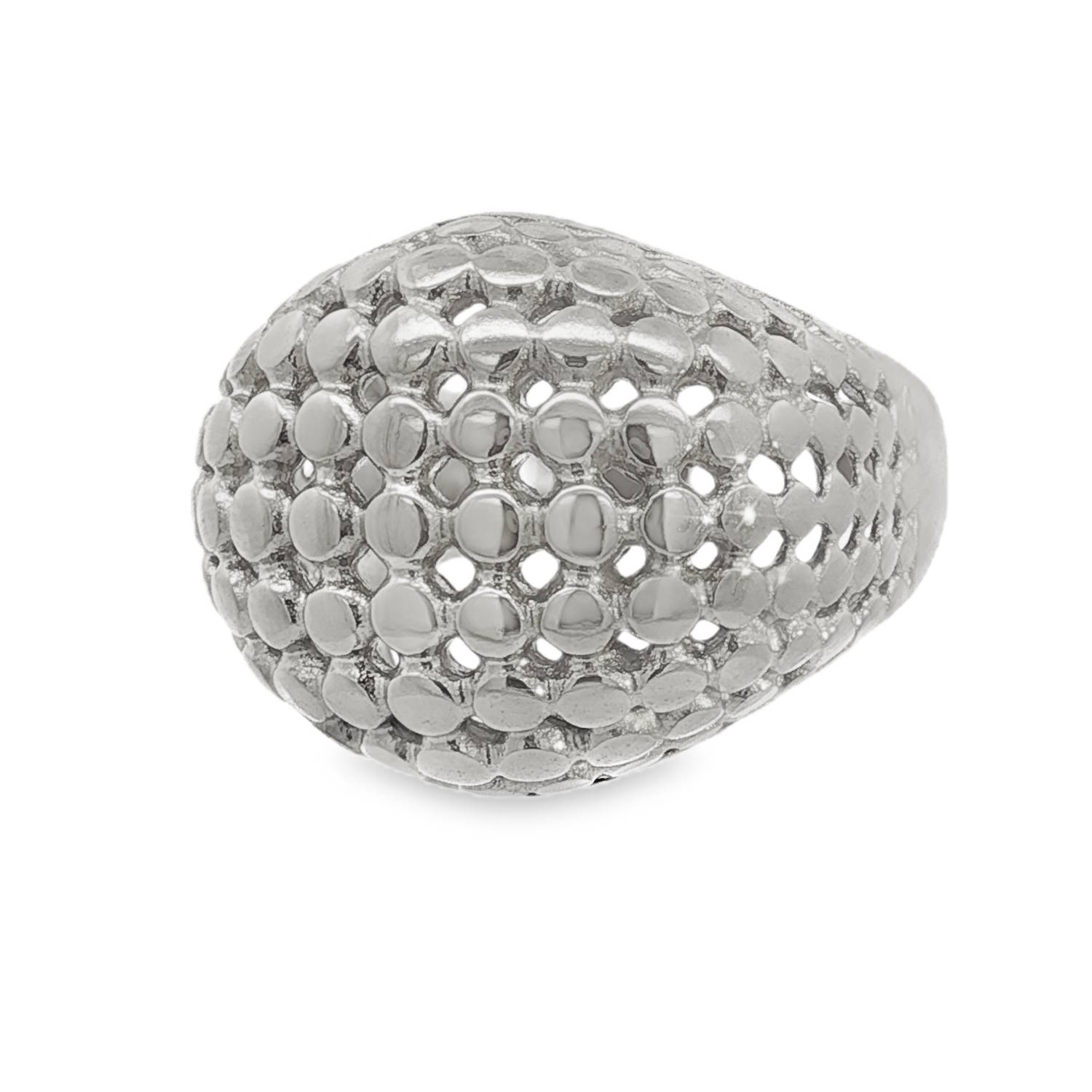 Cette bague cocktail en acier argenté est une pièce audacieuse et élégante.