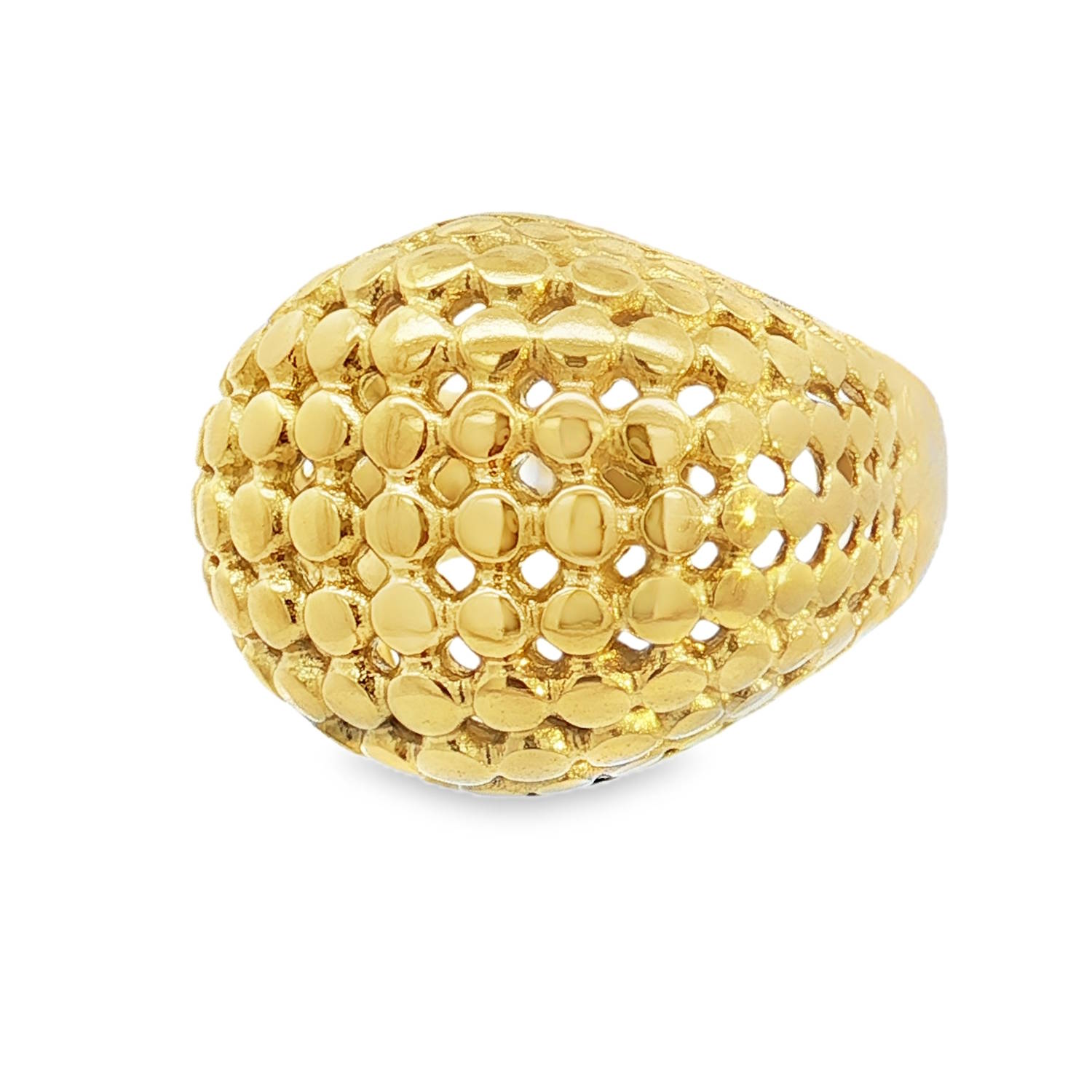Cette bague cocktail en acier doré est une pièce audacieuse et élégante.