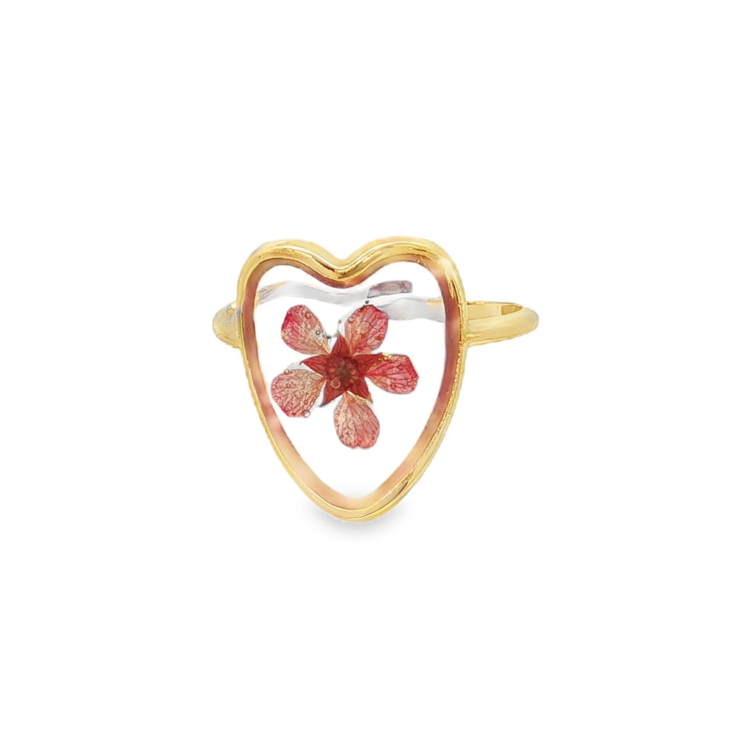 Captivez les regards avec cette bague délicate en métal doré, ornée d'une fleur séchée enchâssée dans une forme de cœur.