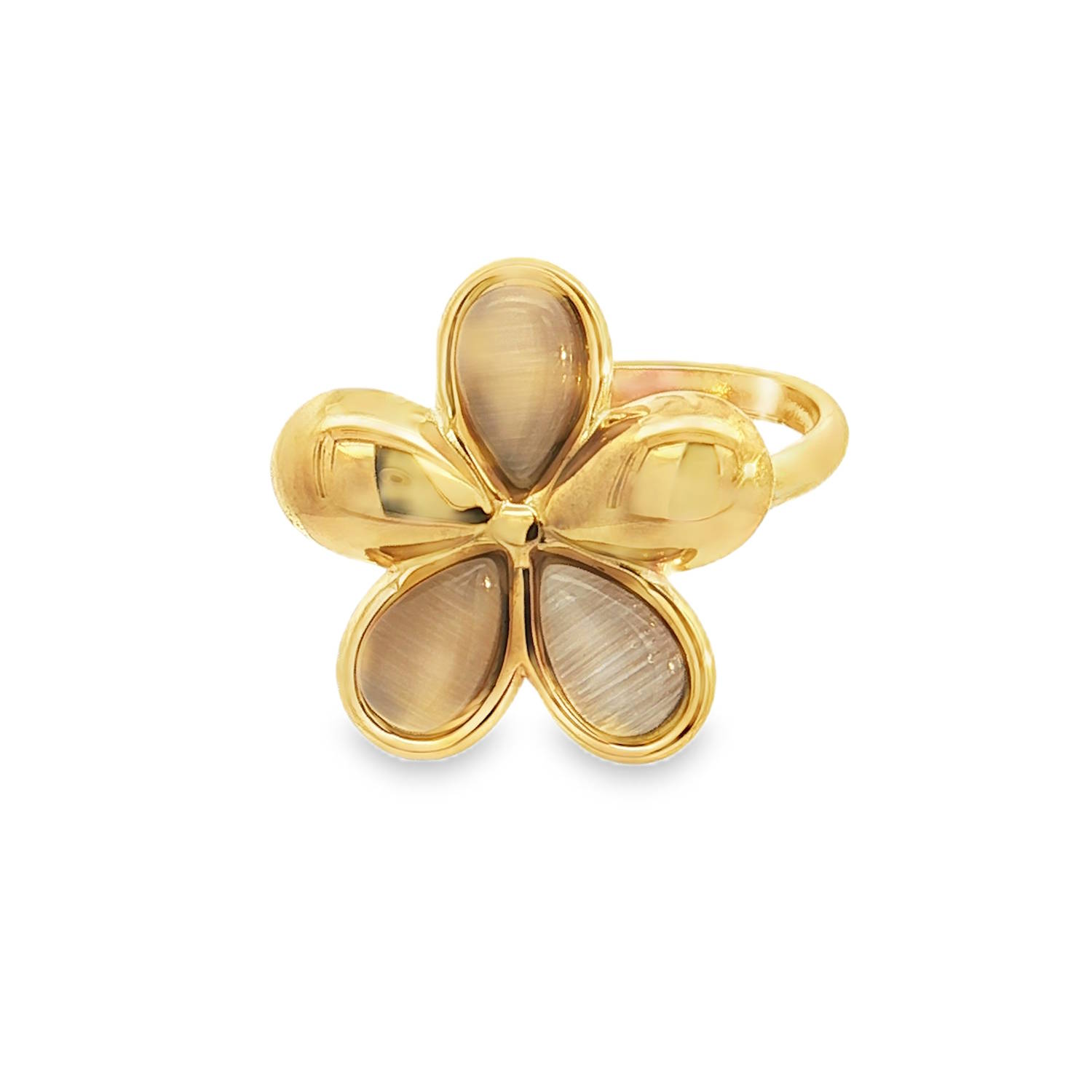 Sublime bague cocktail en métal doré, ornée d'une fascinante fleur sertie de cymophane.