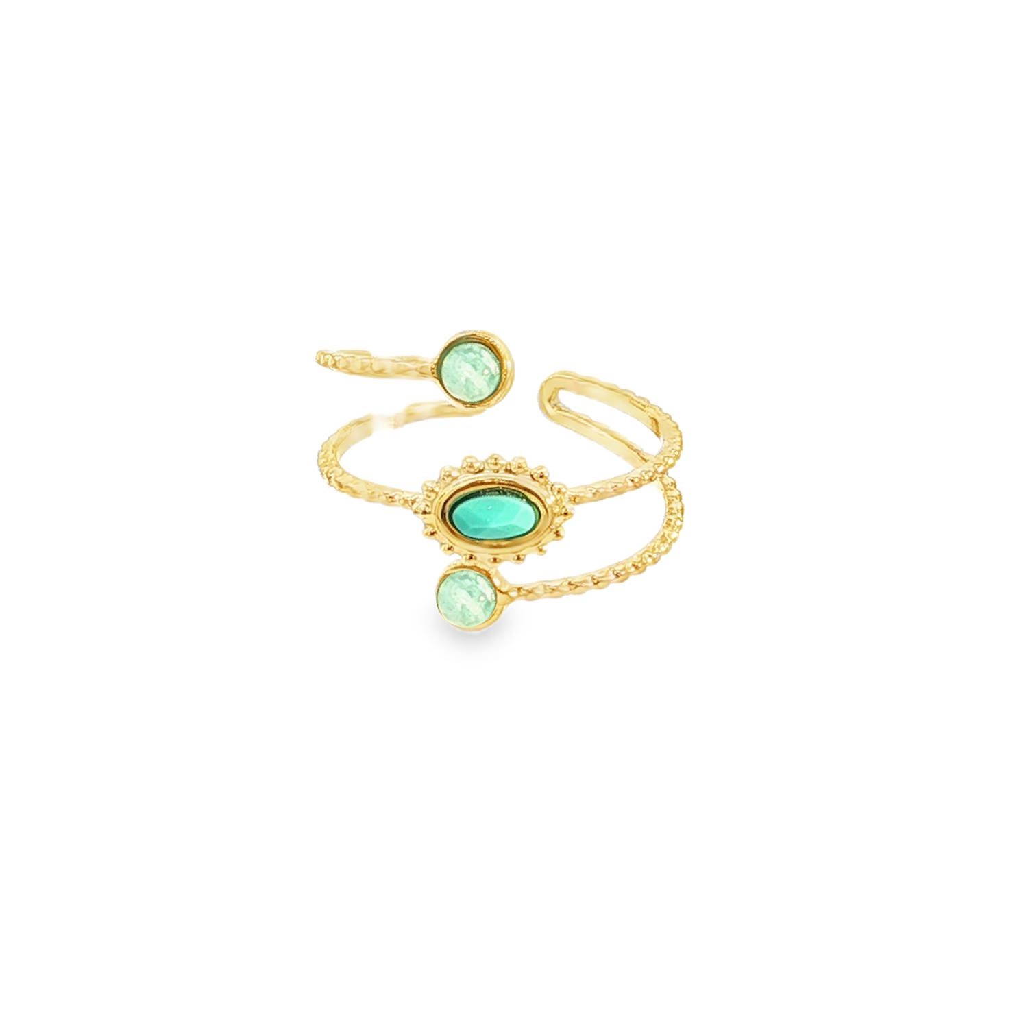 Cette bague multi-pierres en acier doré est ornée d'une pierre turquoise ovale cabochon d'un bleu-vert délicat.<br/>Le design raffiné et la couleur apaisante de la turquoise en font un bijou idéal pour ajouter une touche d'élégance discrète à votre quotidien.<br/>Un accessoire sophistiqué pour toutes les occasions.<br/>Taille ajustable. Rond  Adolescent Adulte Femme Fille Indémodable