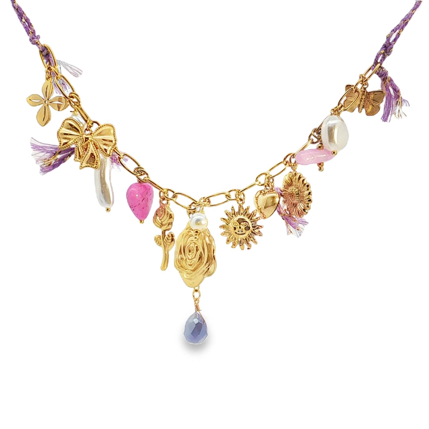 Ce collier à breloques en acier doré est une pièce fantaisiste et charmante.